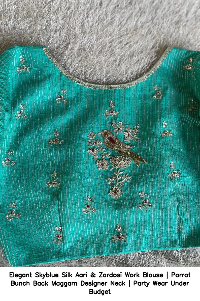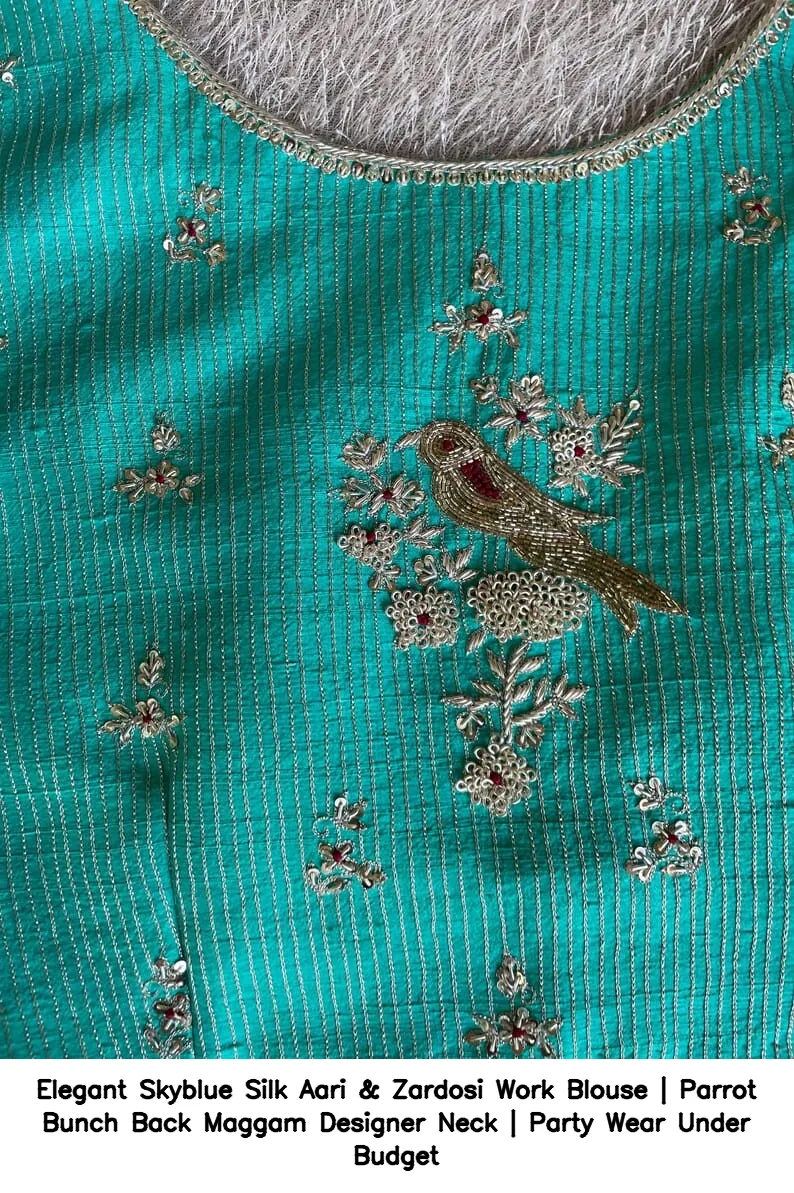 Elegant Skyblue Silk Aari & Zardosi Work Blouse | Parrot Bunch Back Maggam Designer Neck | Party Wear Under Budget