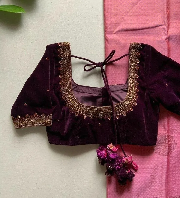 To maintain the beauty of your Wine Colour Velvet Handmade Designer Blouse, hand wash it gently. Avoid harsh detergents and direct sunlight. Therefore, store it in a cool, dry place to preserve its quality.