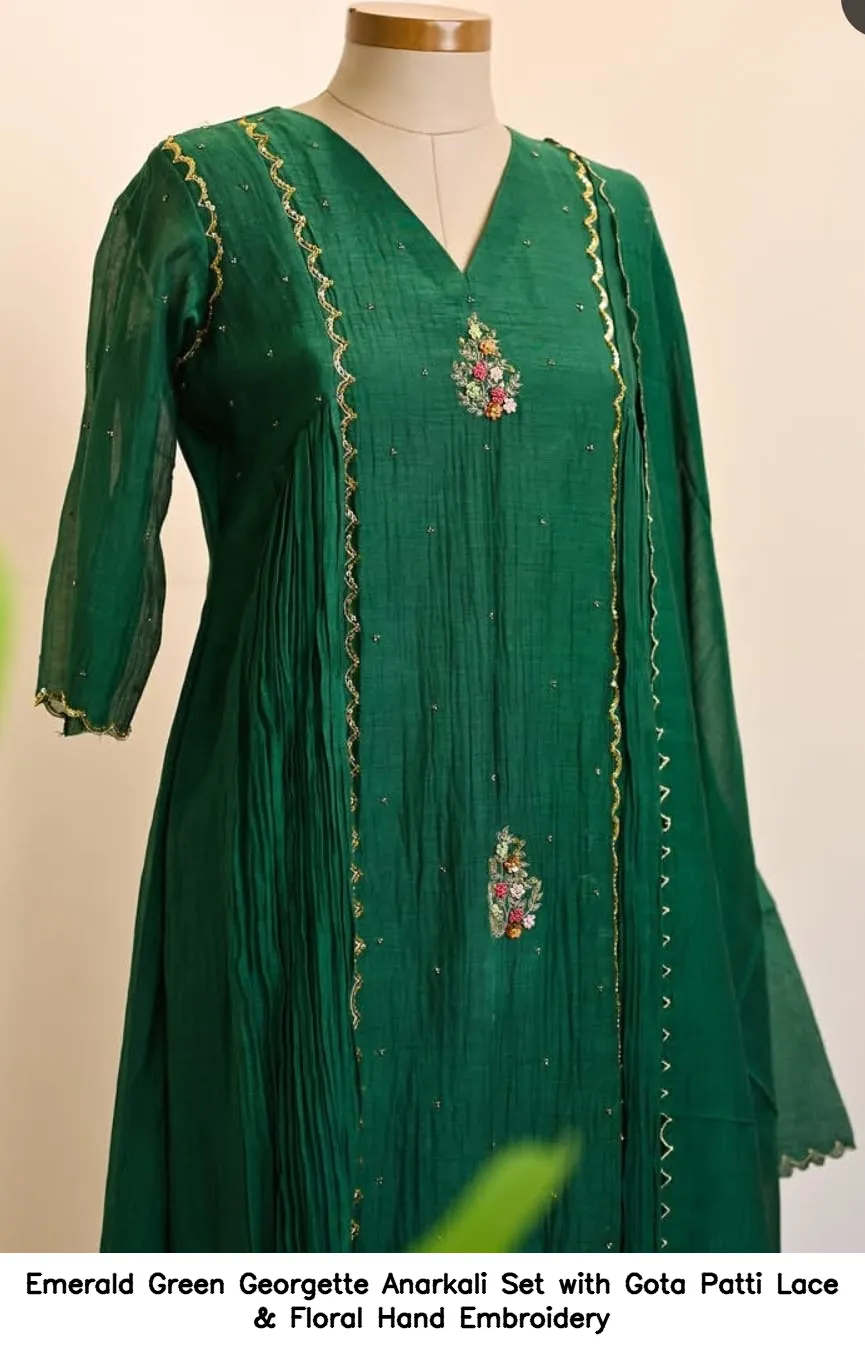 Emerald Green Georgette Anarkali Set with Gota Patti Lace & Floral Hand Embroidery