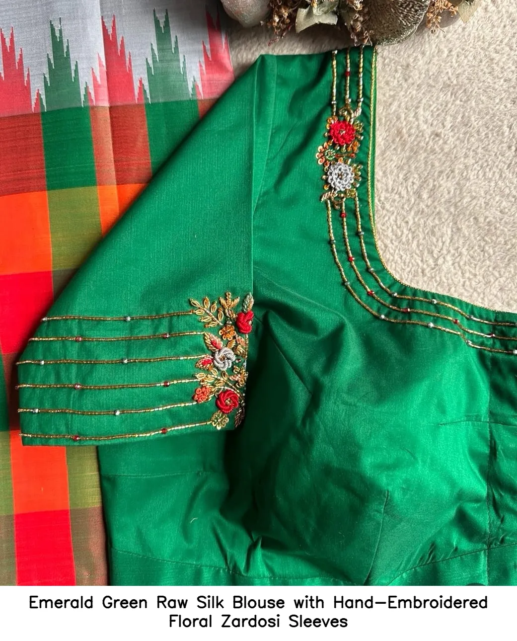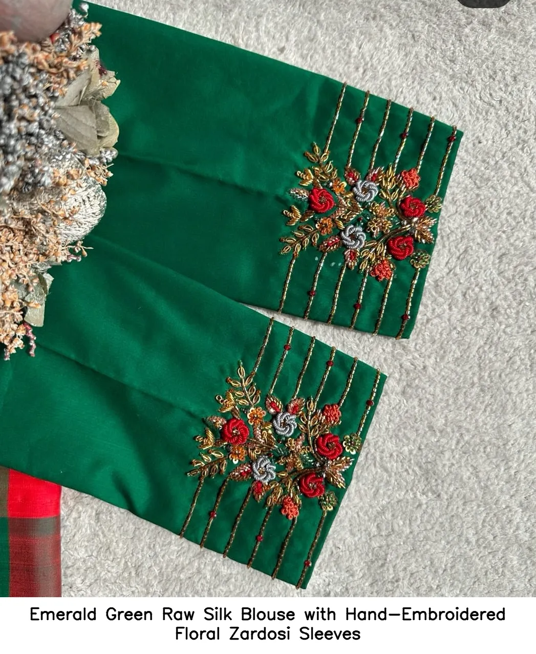 Product Name: ​​​​​​​Emerald Green Raw Silk Blouse with Hand-Embroidered Floral Zardosi Sleeves