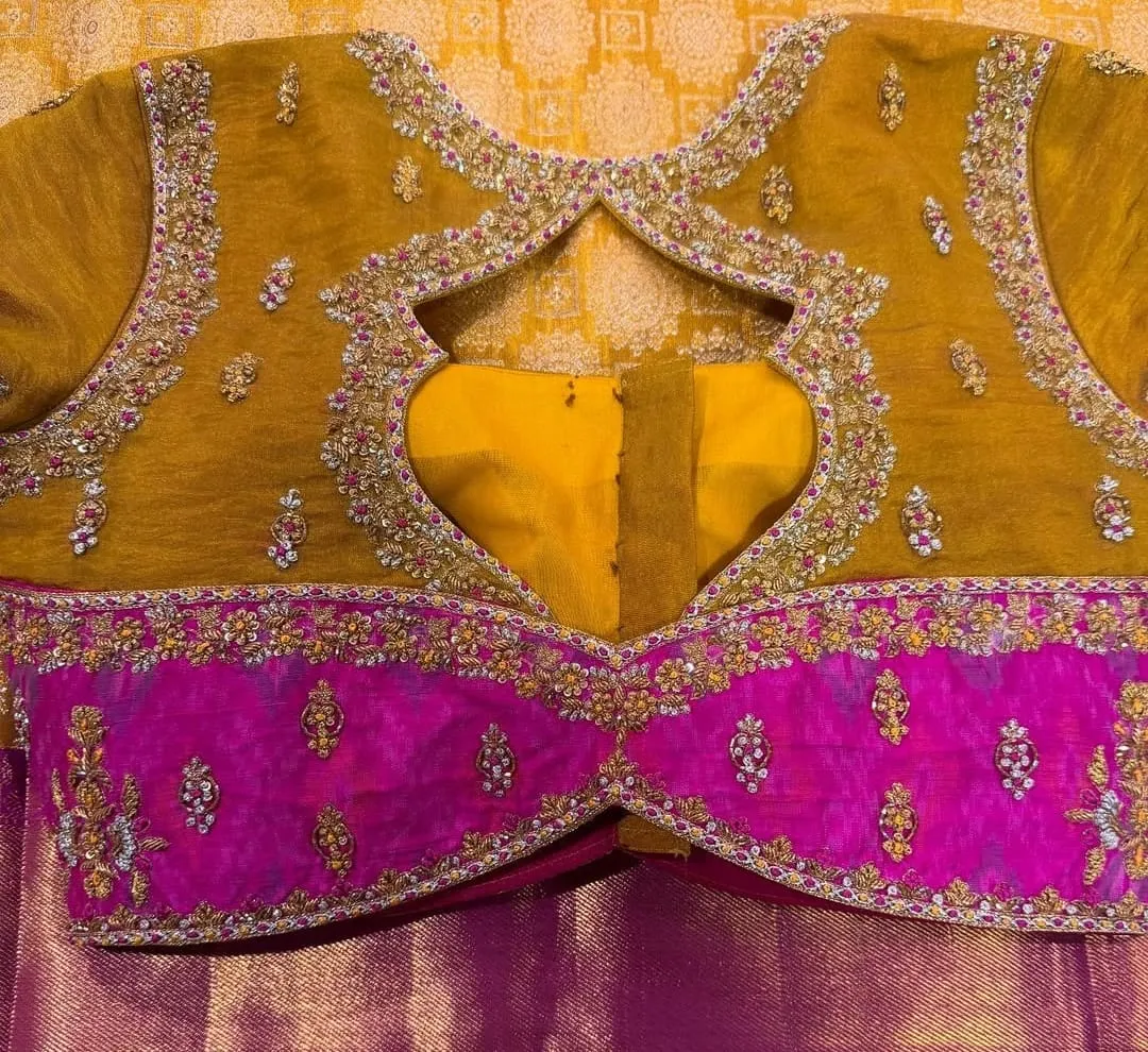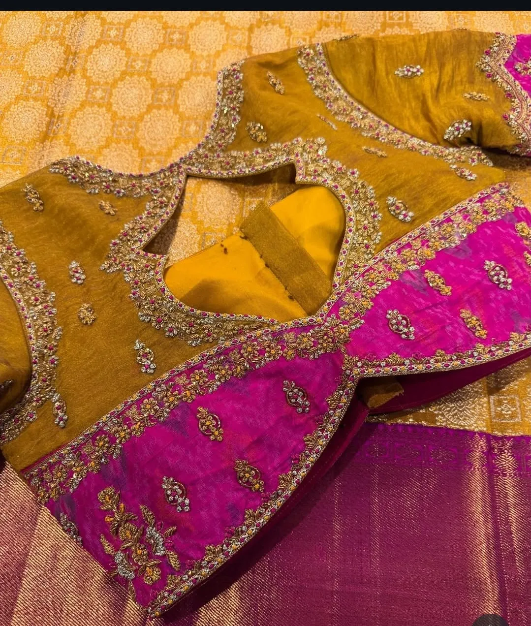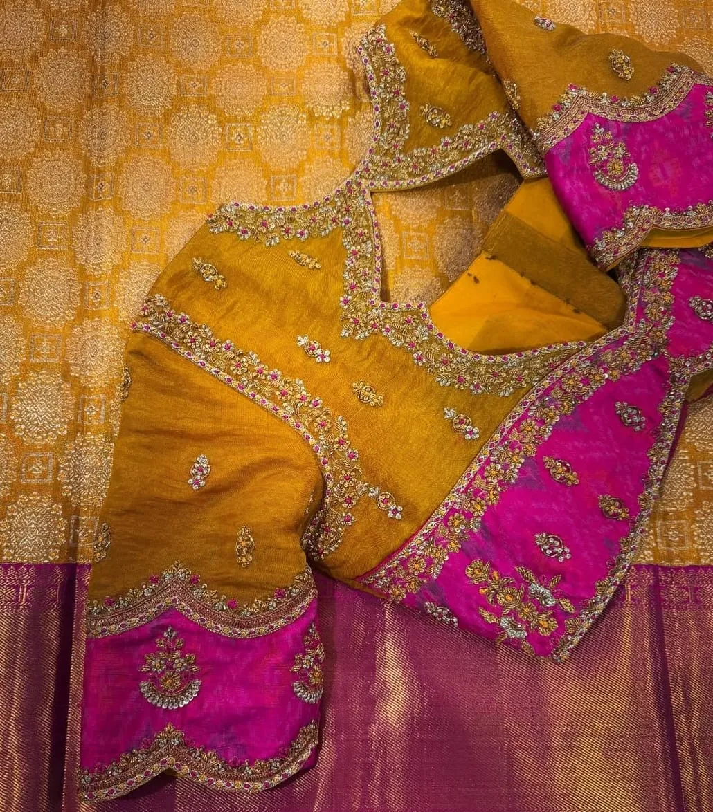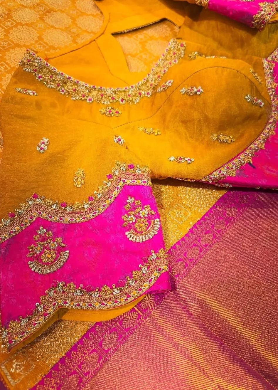 Exclusive Aliya Cut Maggam Aari Work Blouse Mustard Yellow & Pink Designer Party Wear Buy Online