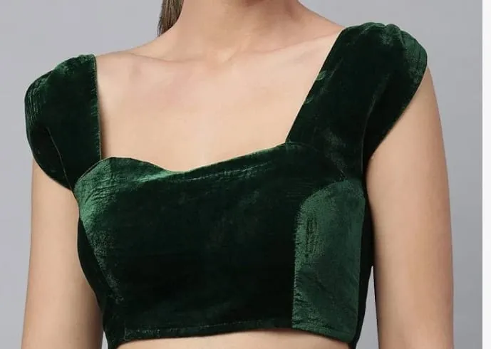 Exclusive Bottle Green Velvet Crop Top Tailored Sweetheart Neck Design Own This Look is the perfect addition to your wardrobe. This designer blouse enhances your style effortlessly. Moreover, its unique design makes it suitable for various occasions.