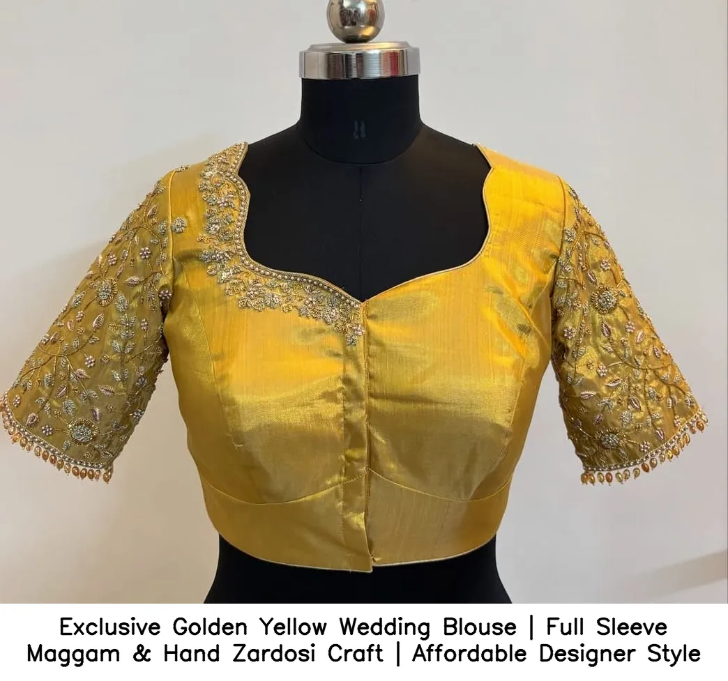 Exclusive Golden Yellow Wedding Blouse | Full Sleeve Maggam & Hand Zardosi Craft | Affordable Designer Style offers elegance and charm. Moreover, it enhances your wedding attire beautifully. This blouse combines traditional craftsmanship with modern design, making it a perfect choice for brides and bridesmaids alike.