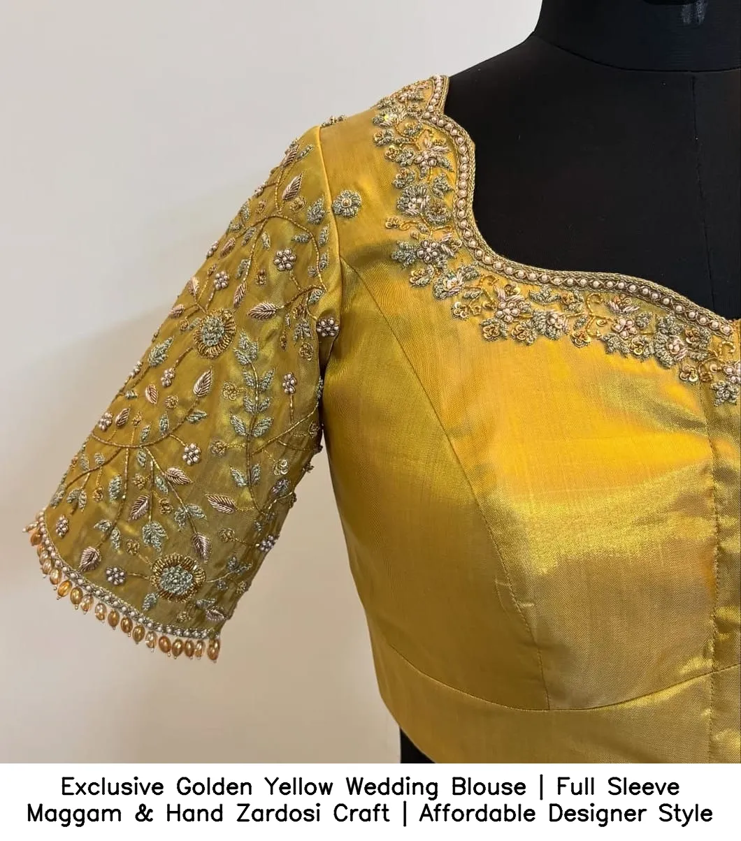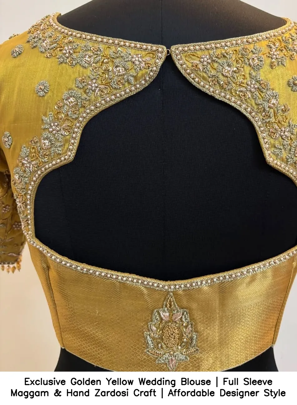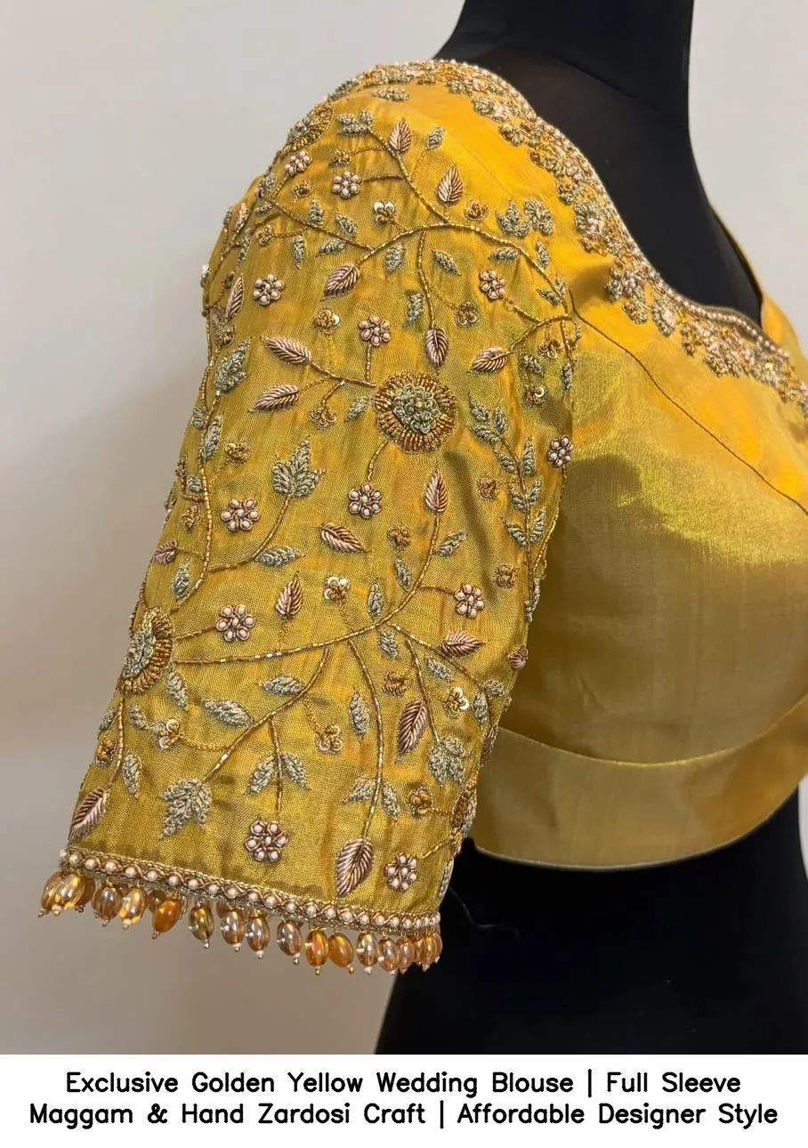 Exclusive Golden Yellow Wedding Blouse | Full Sleeve Maggam & Hand Zardosi Craft | Affordable Designer Style Features and Benefits