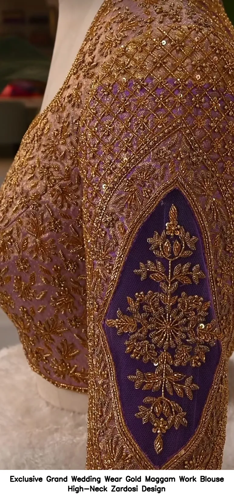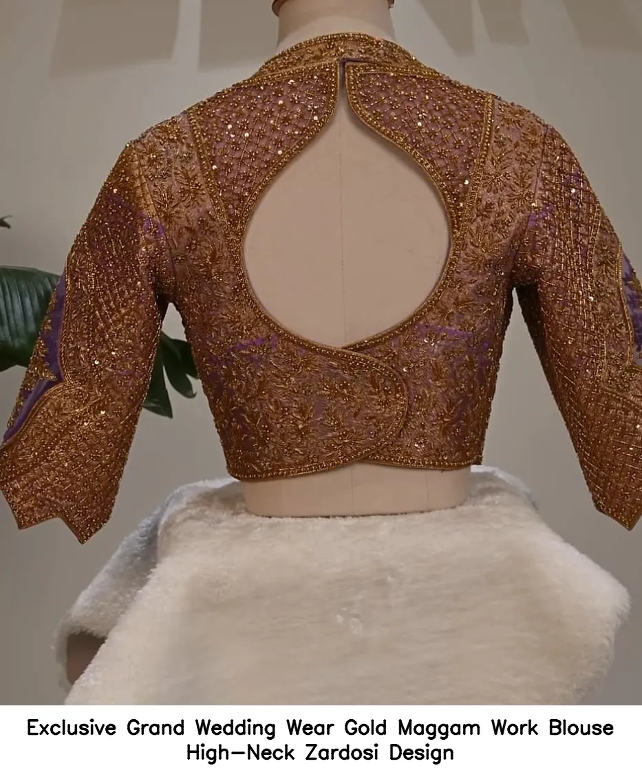 Product Name: ​Exclusive Grand Wedding Wear Gold Maggam Work Blouse – High-Neck Zardosi Design