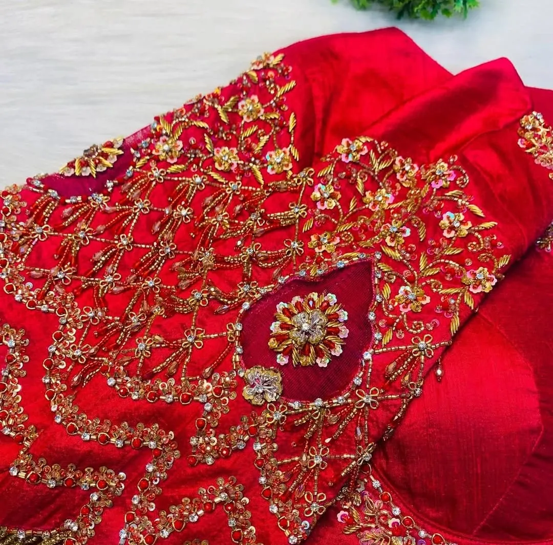 Stunning Red Raw Silk with Maggam Work blouse. Crafted for wedding and festive wear, pairs beautifully with silk sarees and lehengas.