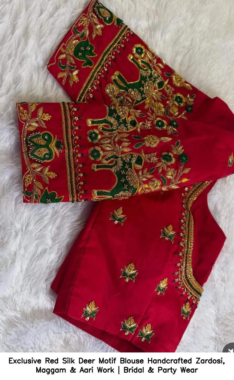Exclusive Red Silk Deer Motif Blouse – Handcrafted Zardosi, Maggam & Aari Work | Bridal & Party Wear