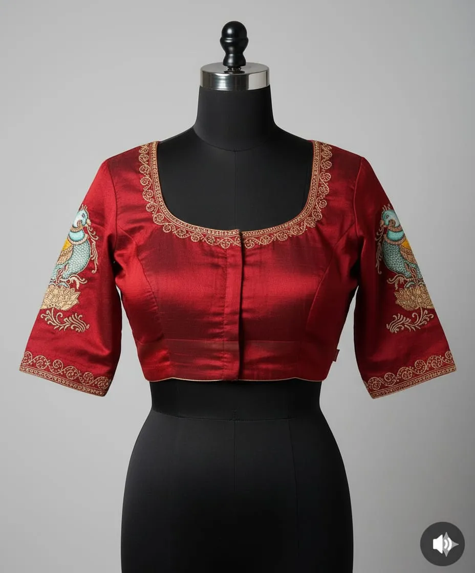 Tanjore Art Peacock Blouse in Red Raw Silk Premium Bridal Masterpiece Features and Benefits