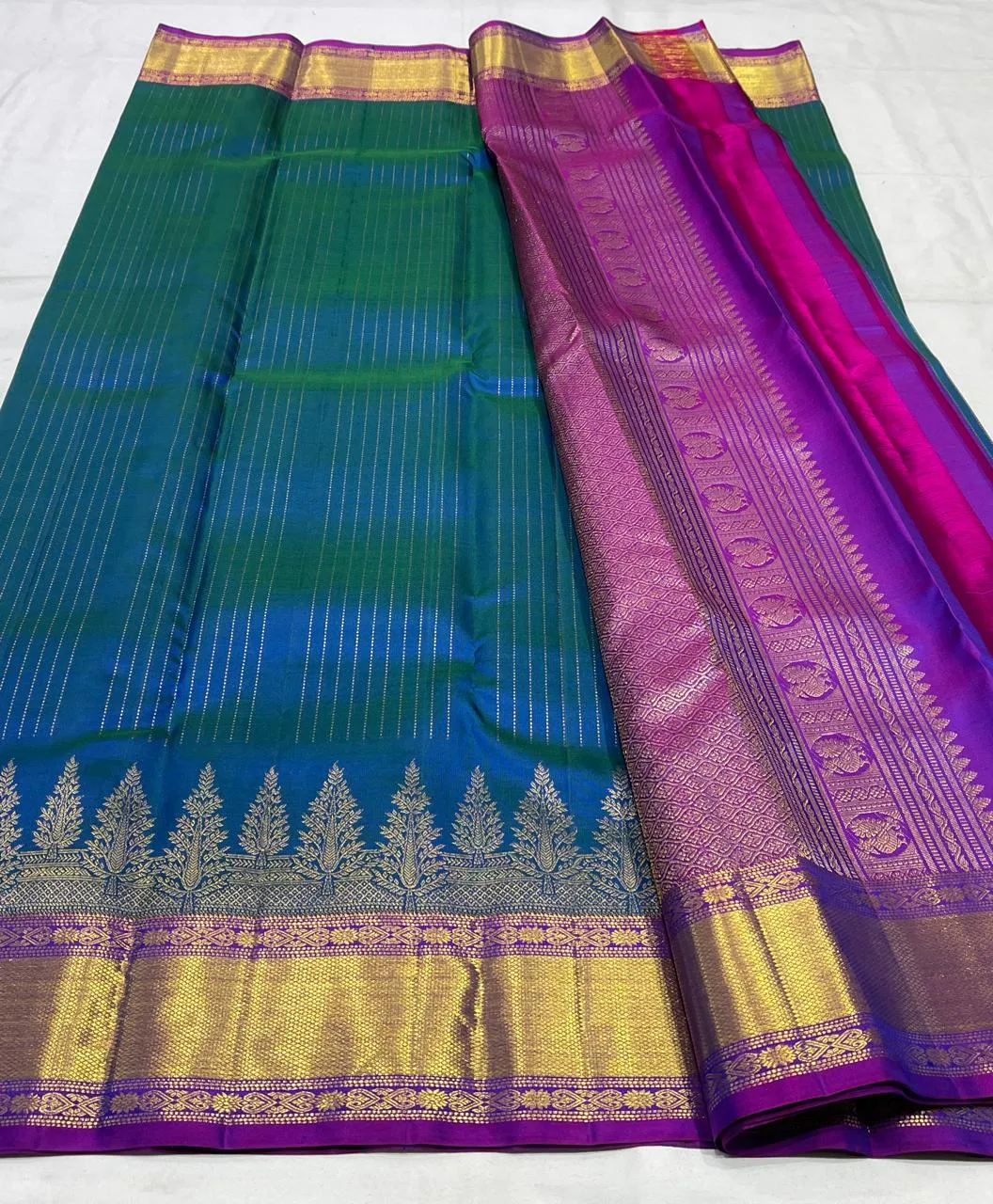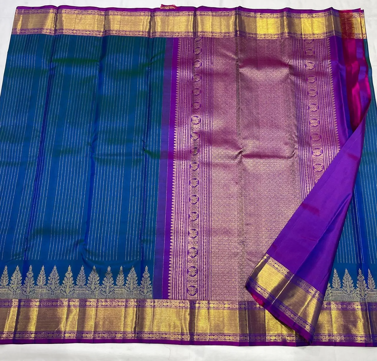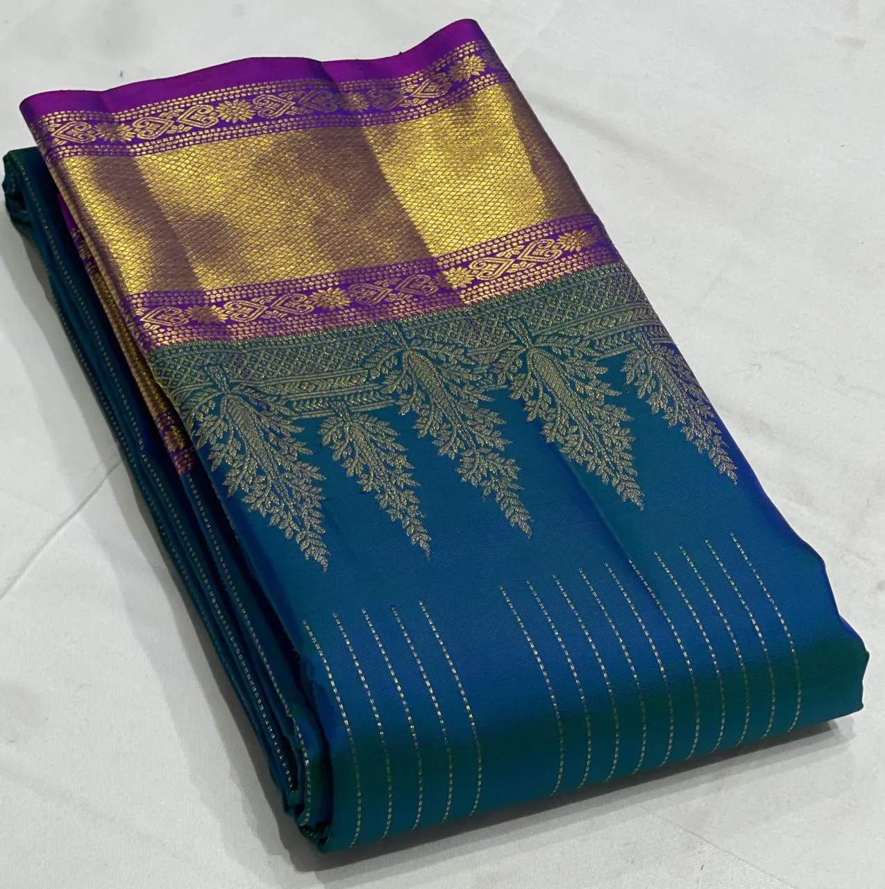 Exquisite Blue Pure Kanchipuram Silk Saree Handloom Crafted with 2G++ Pure Zari Silk Mark Tag