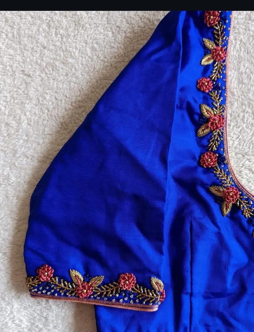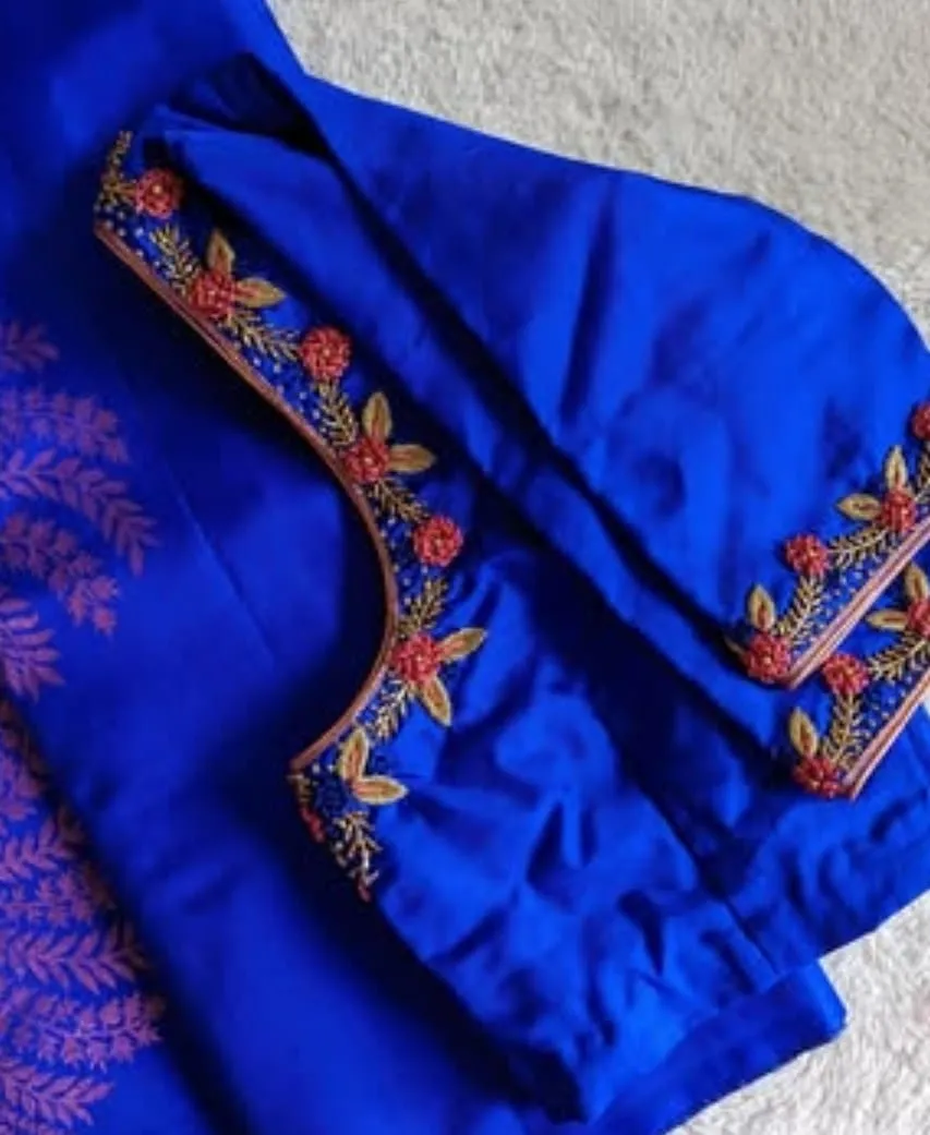 The Exquisite Blue Thread Maggam Work Blouse is made from premium half pattu fabric. It is available in sizes XL, XXL, and 3XL. You can choose from a variety of colors including Red, Pink, Blue, Purple, and Wine. For more options, browse our collection.