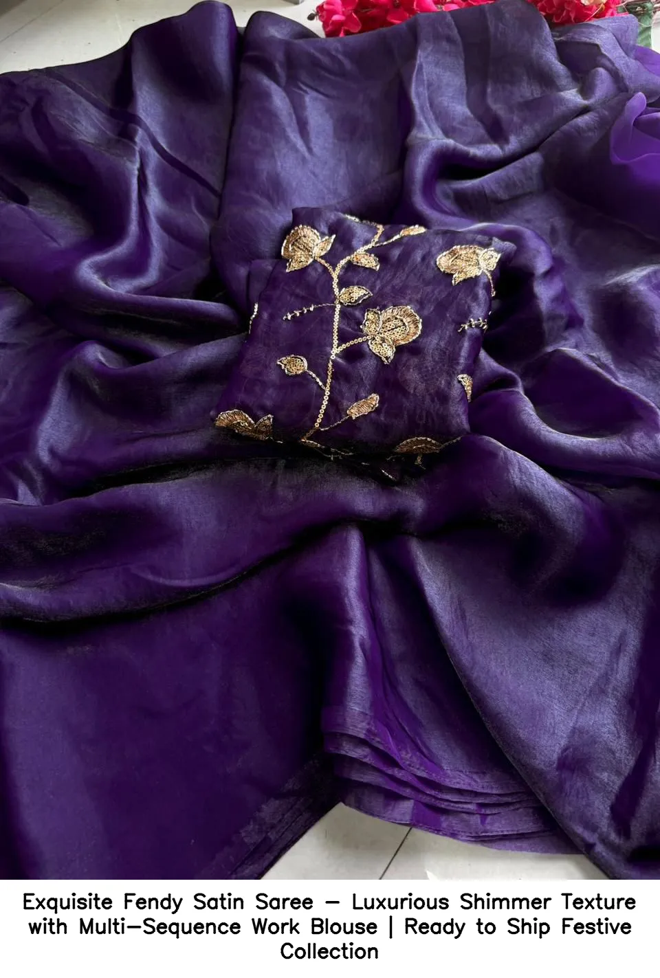 To maintain the beauty of the Exquisite Fendy Satin Saree – Luxurious Shimmer Texture with Multi-Sequence Work Blouse, hand wash gently in cold water. Avoid harsh detergents and do not wring. Hang to dry in the shade for best results.