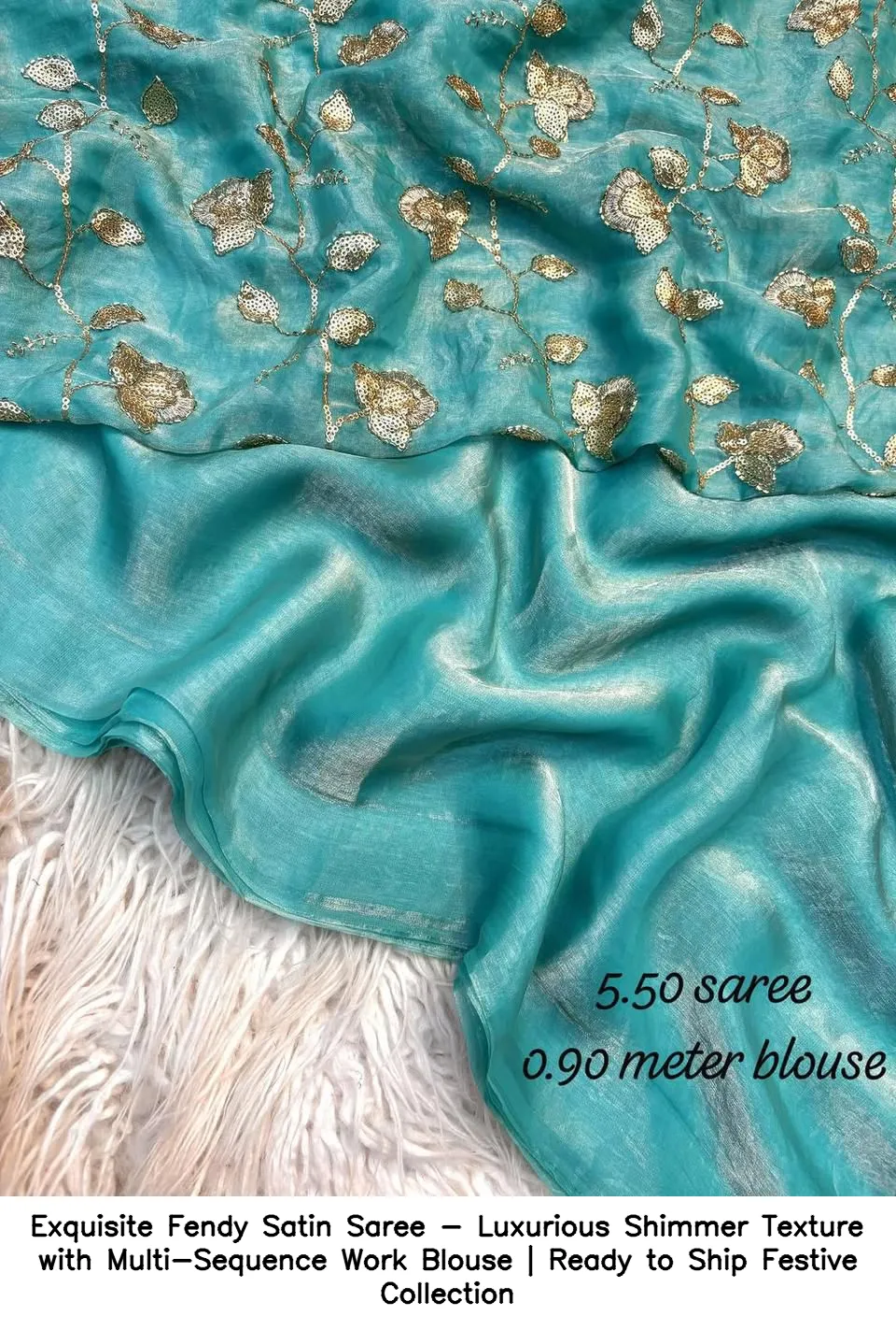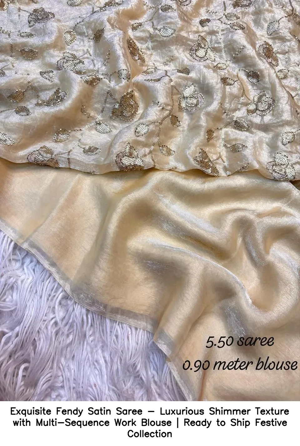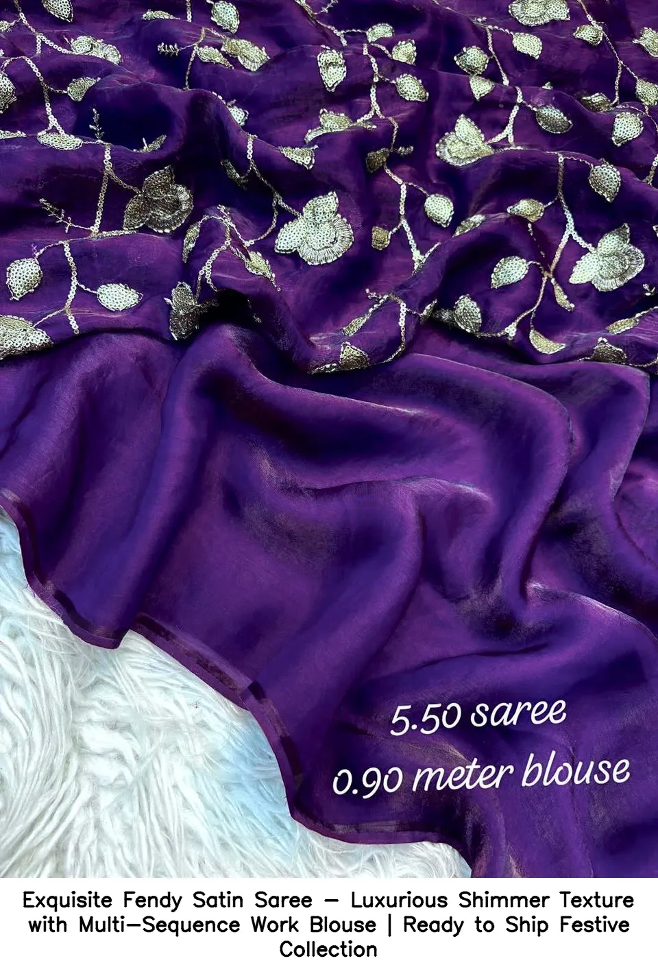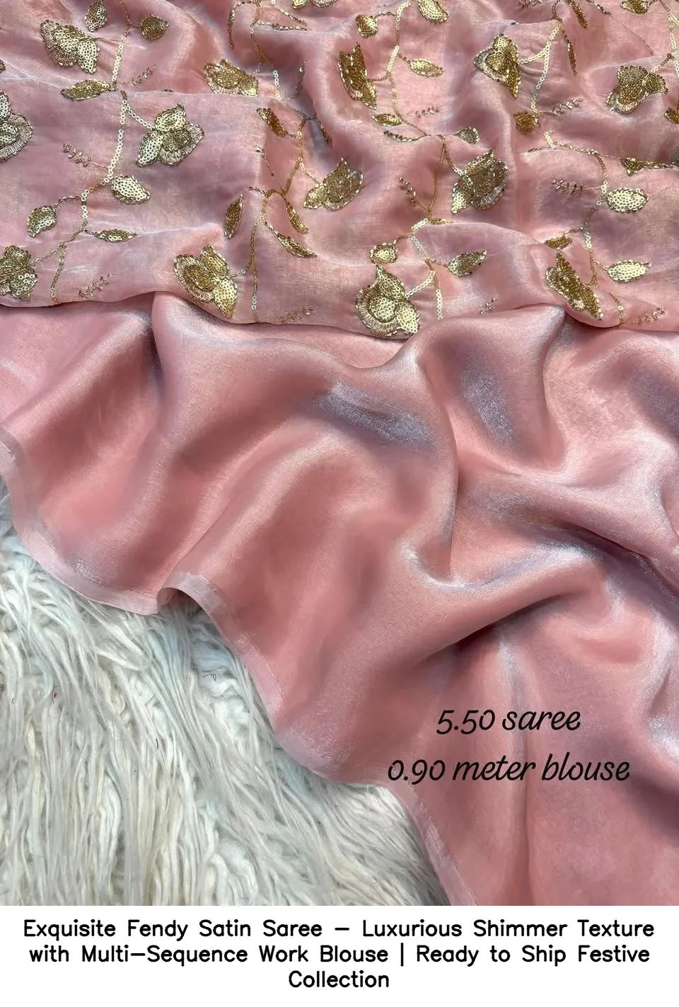 Exquisite Fendy Satin Saree – Luxurious Shimmer Texture with Multi-Sequence Work Blouse | Ready to Ship Festive Collection