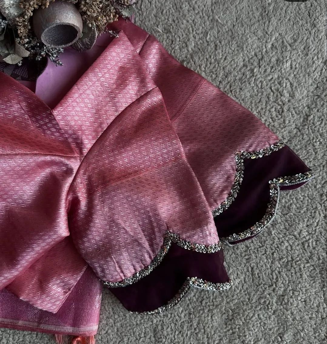 Stunning Peach Raw Silk with Maggam Work blouse. Crafted for wedding and festive wear, pairs beautifully with silk sarees and lehengas.