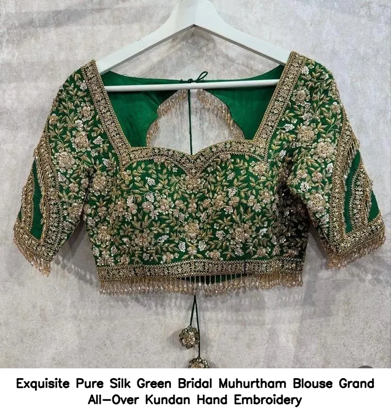 Why Choose Exquisite Pure Silk Green Bridal Muhurtham Blouse – Grand All-Over Kundan Hand Embroidery?