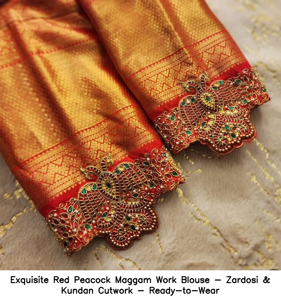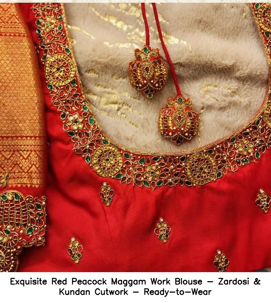 Why Choose Exquisite Red Peacock Maggam Work Blouse – Zardosi & Kundan Cutwork – Ready-to-Wear?
