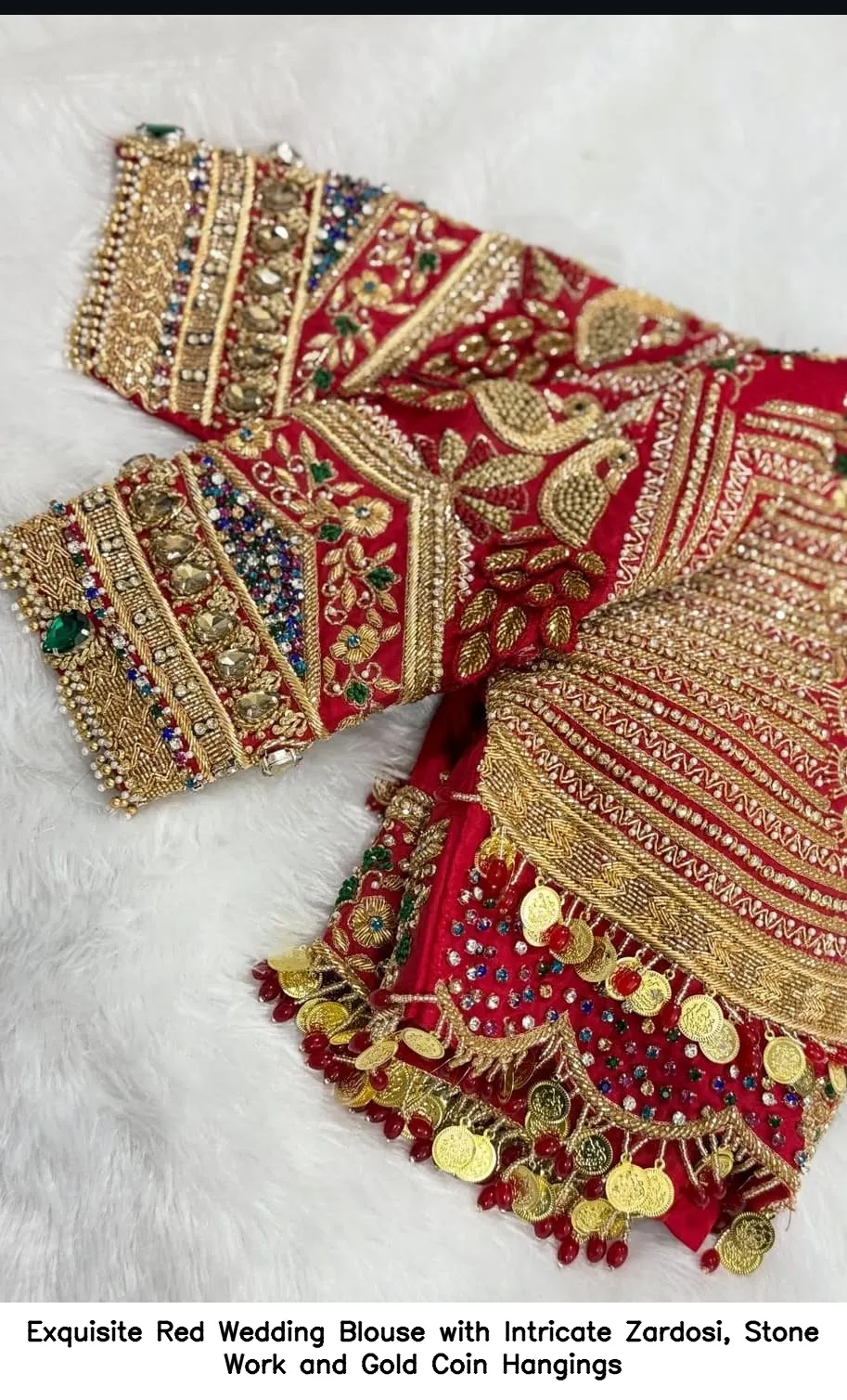 Product Name: Exquisite Red Wedding Blouse with Intricate Zardosi, Stone Work and Gold Coin Hangings