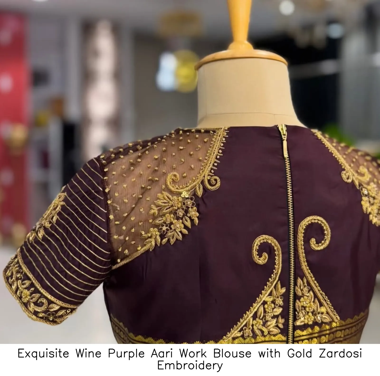 Exquisite Wine Purple Aari Work Blouse with Gold Zardosi Embroidery
