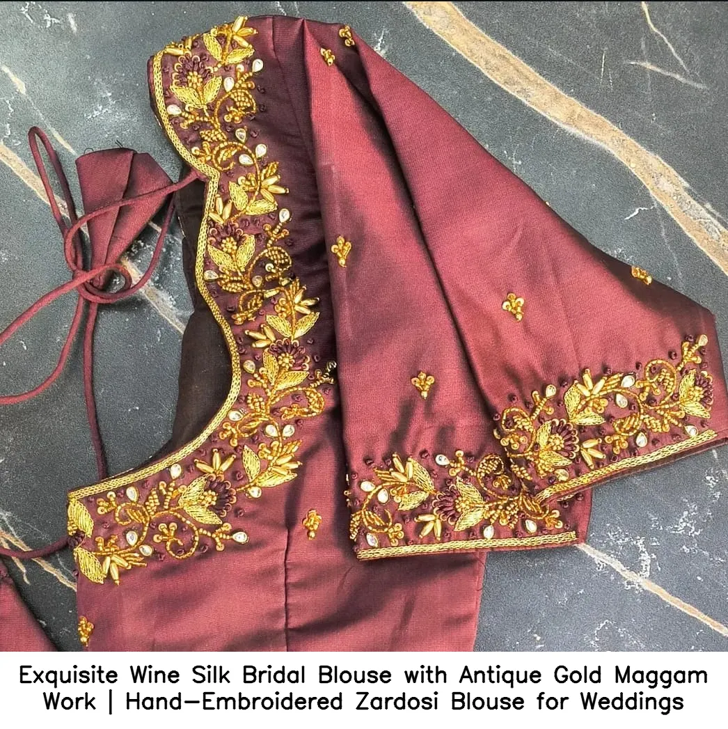 Exquisite Wine Silk Bridal Blouse with Antique Gold Maggam Work | Hand-Embroidered Zardosi Blouse for Weddings