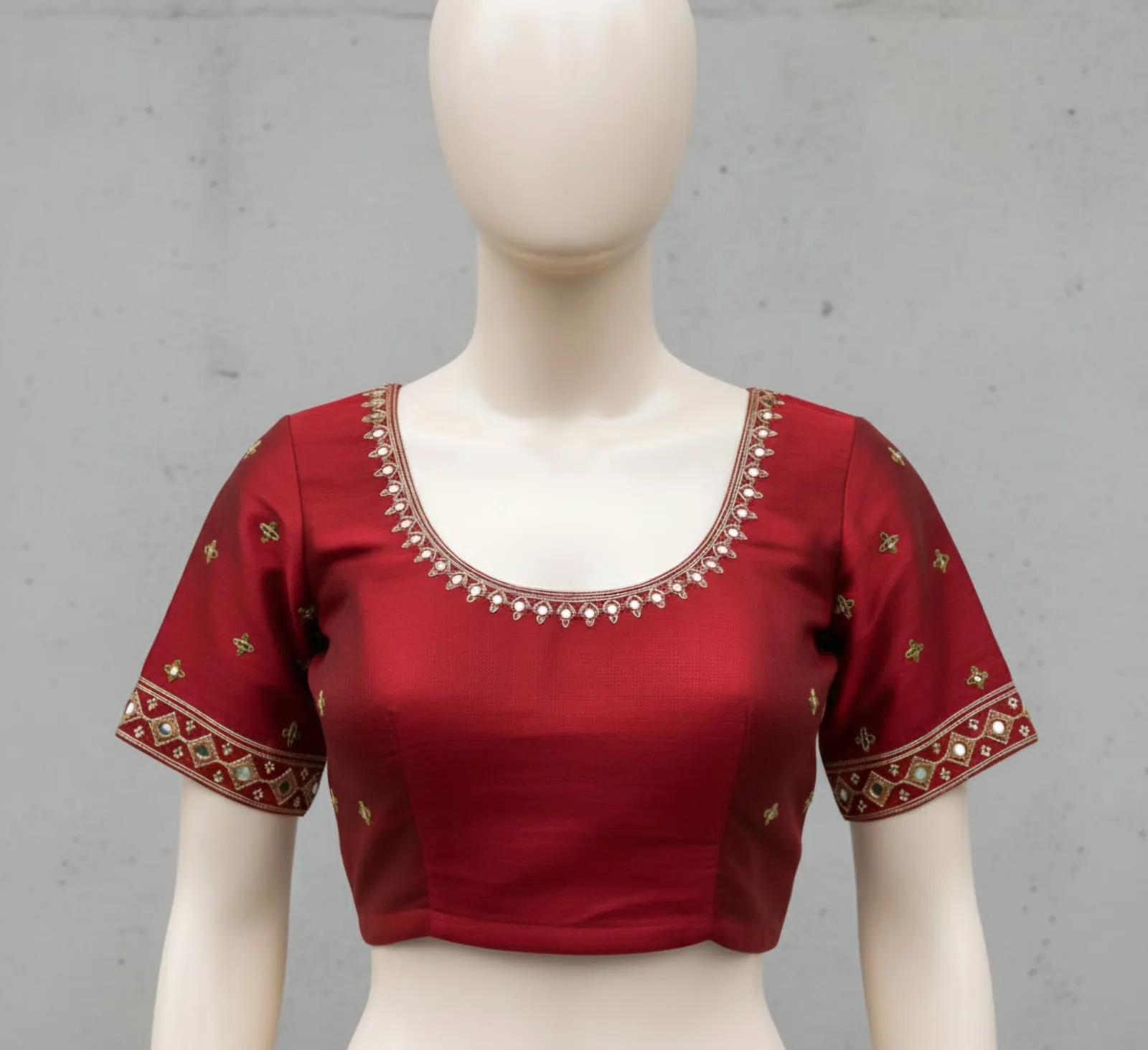 The Eye Catching Red Handcrafted Kutch Blouse is made from half pattu fabric. Available colors include Red, Pink, Blue, Purple, and Wine. For more options, browse our collection today!