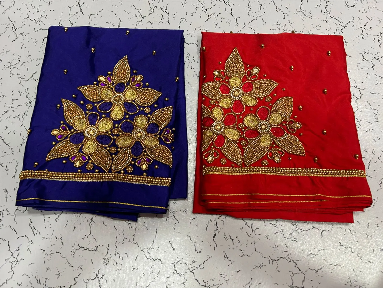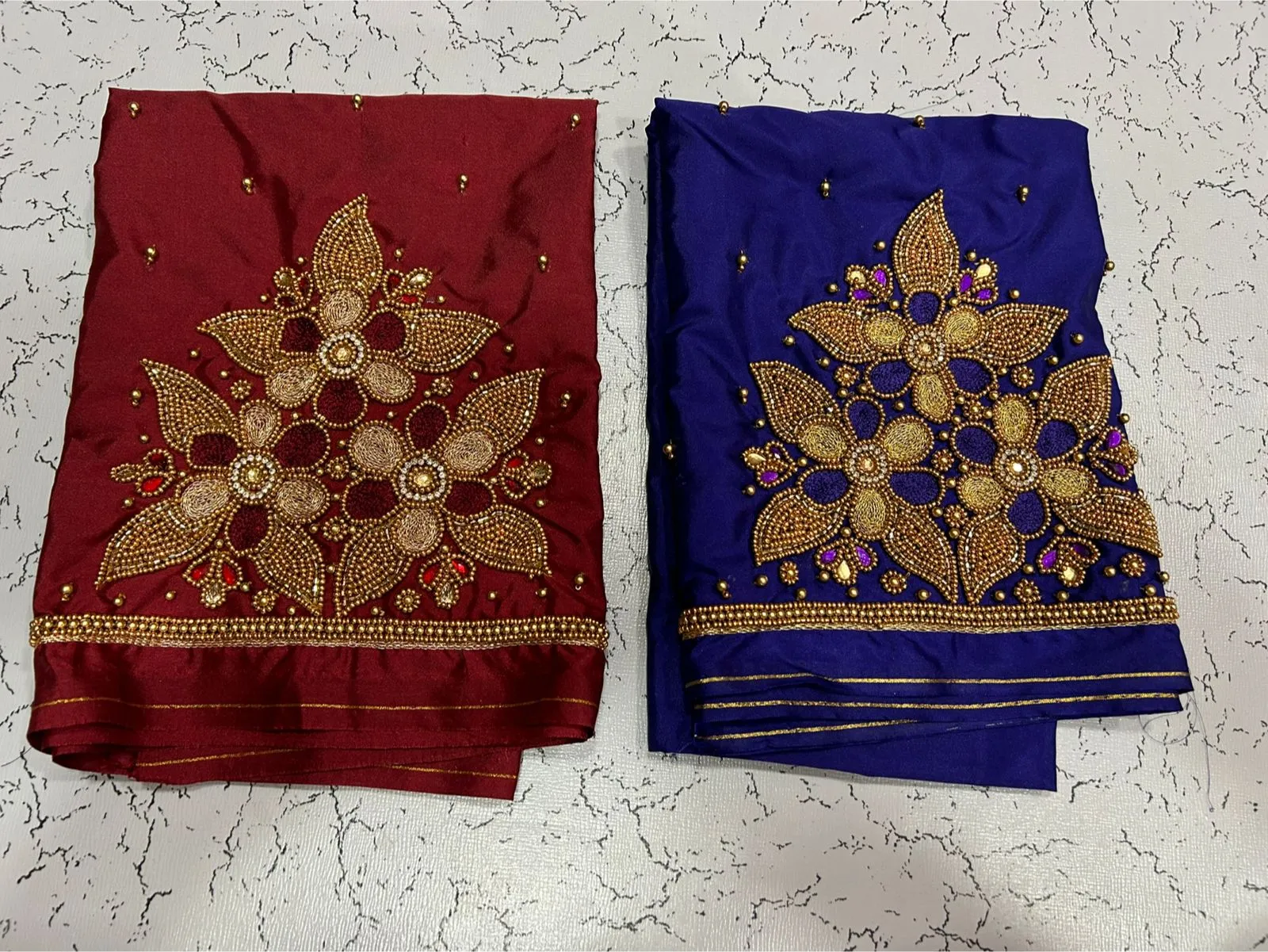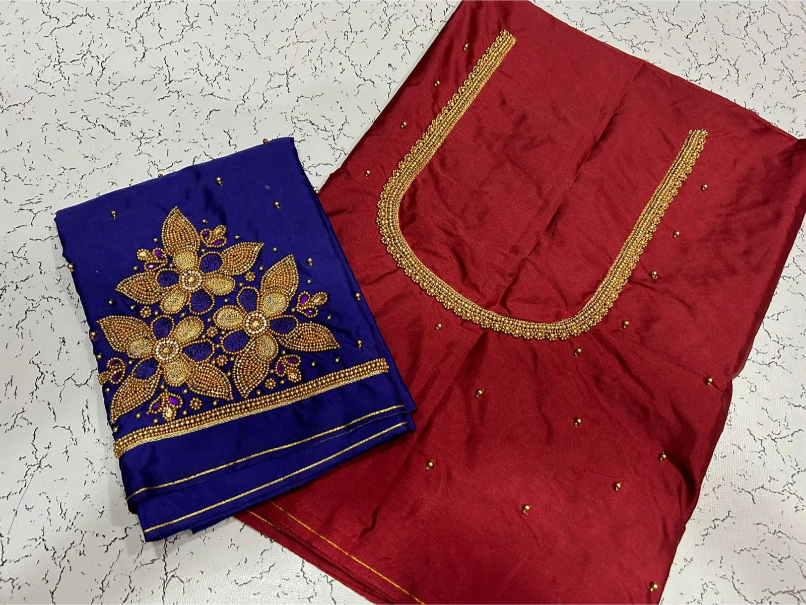 Stunning Raw Silk with Aari Work blouse. Crafted for wedding and festive wear, pairs beautifully with silk sarees and lehengas.