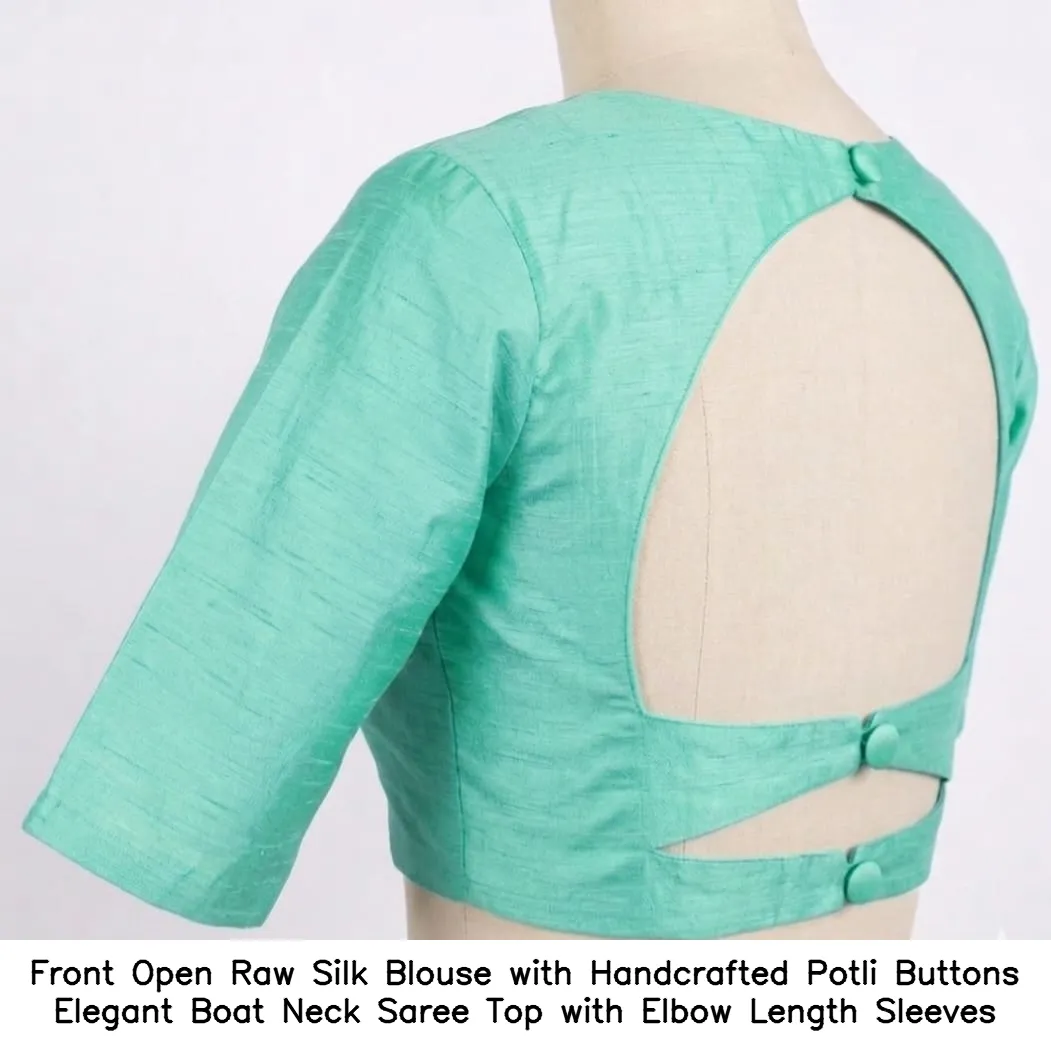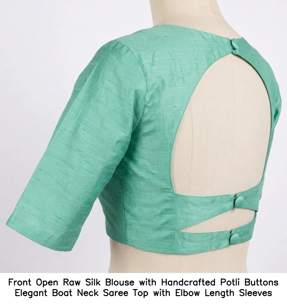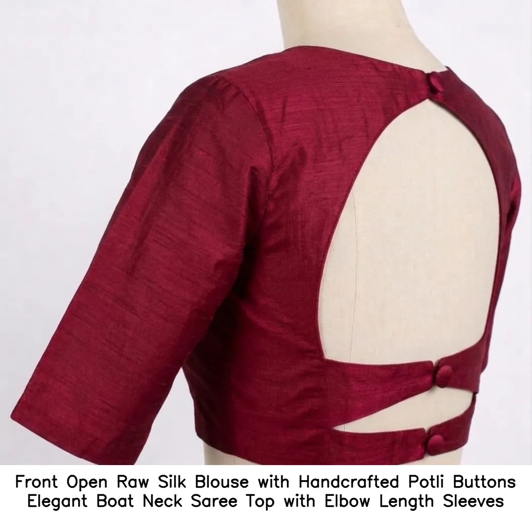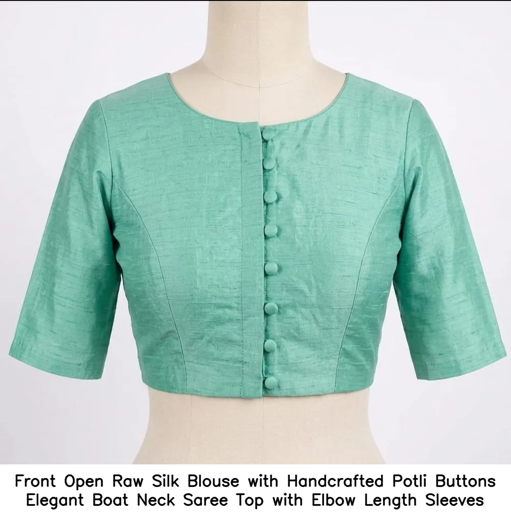 Front Open Raw Silk Blouse with Handcrafted Potli Buttons – Elegant Boat Neck Saree Top with Elbow Length Sleeves