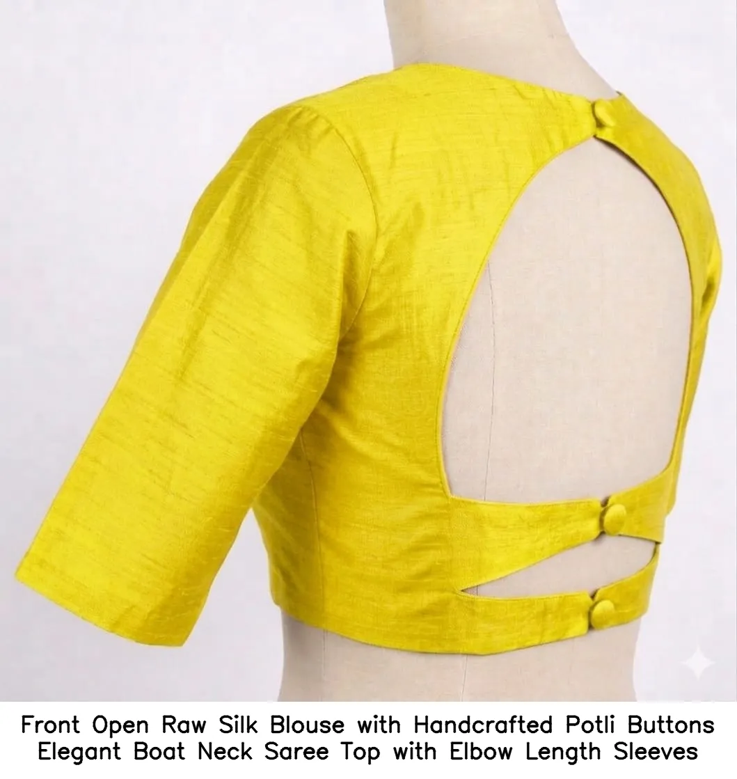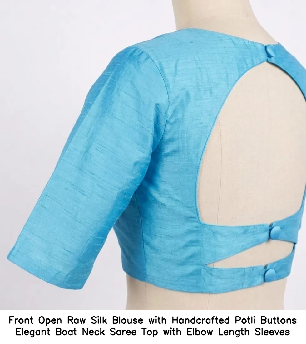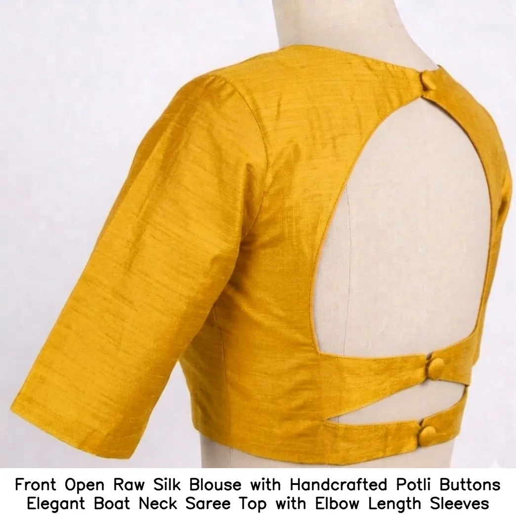 Front Open Raw Silk Blouse with Handcrafted Potli Buttons – Elegant Boat Neck Saree Top with Elbow Length Sleeves