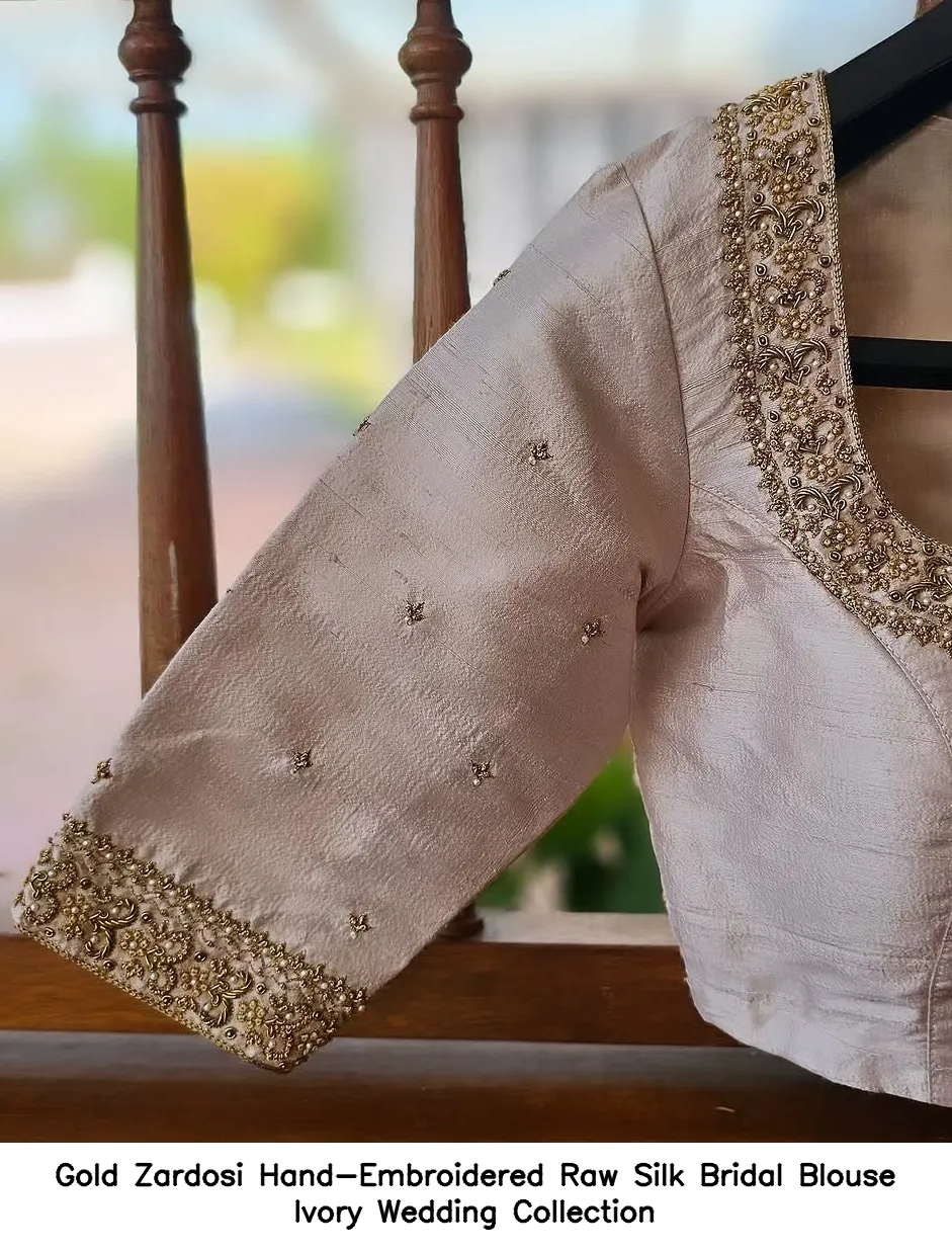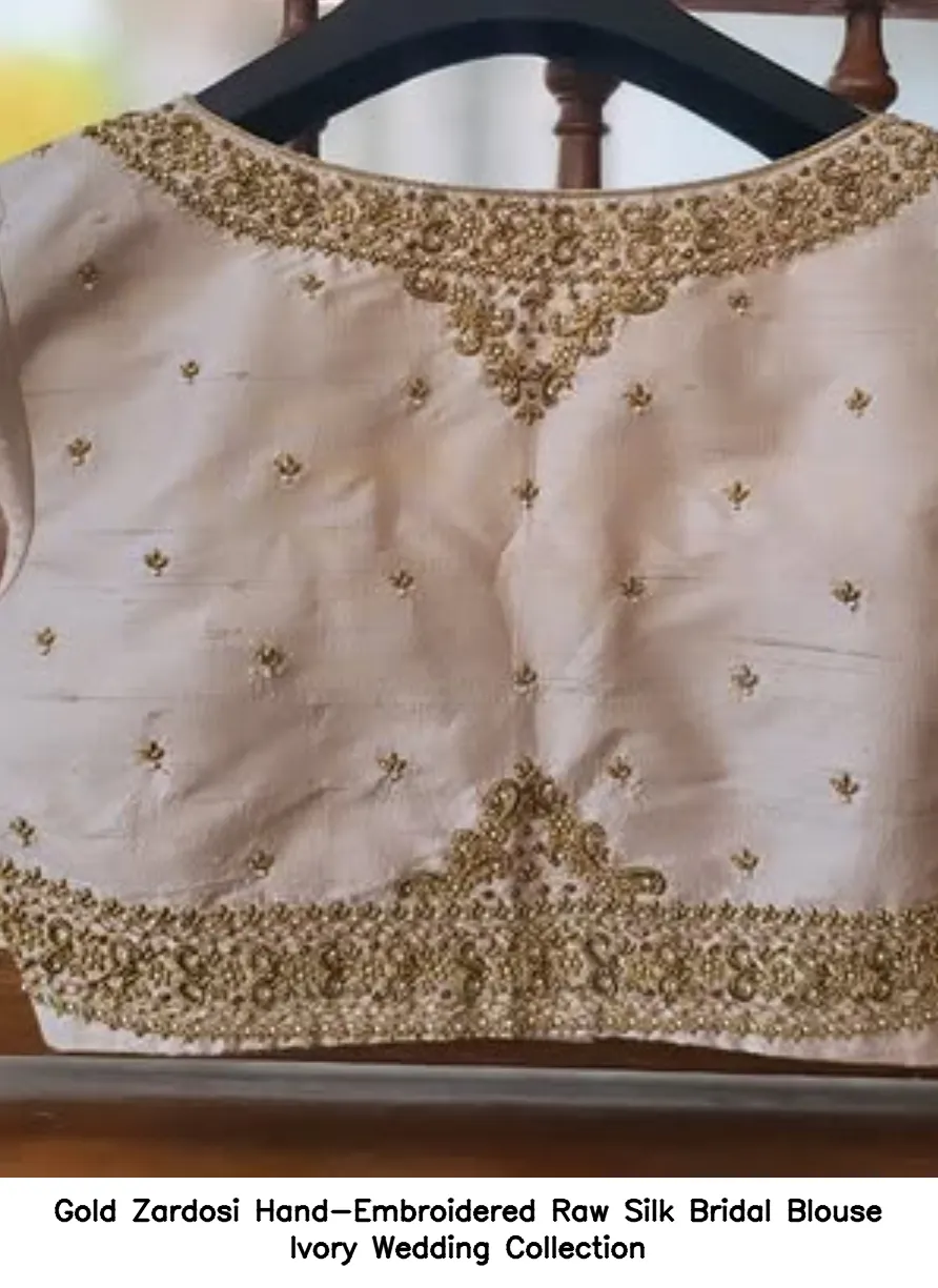 Gold Zardosi Hand-Embroidered Raw Silk Bridal Blouse Ivory Wedding Collection