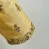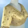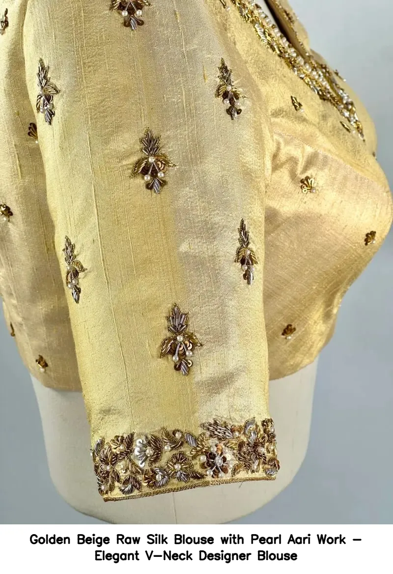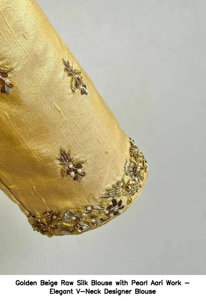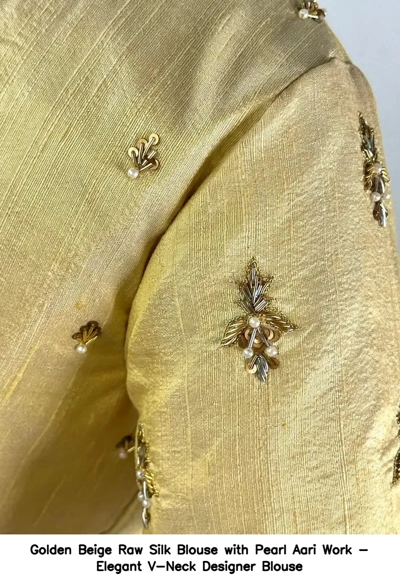 Product Name: ​​​​​Golden Beige Raw Silk Blouse with Pearl Aari Work – Elegant V-Neck Designer Blouse
