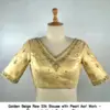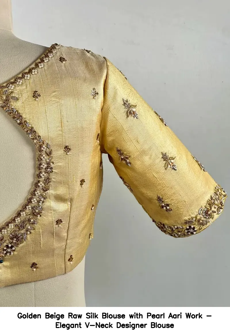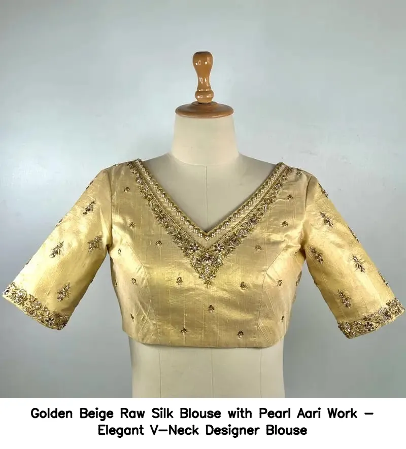 ​​​​​Golden Beige Raw Silk Blouse with Pearl Aari Work – Elegant V-Neck Designer Blouse