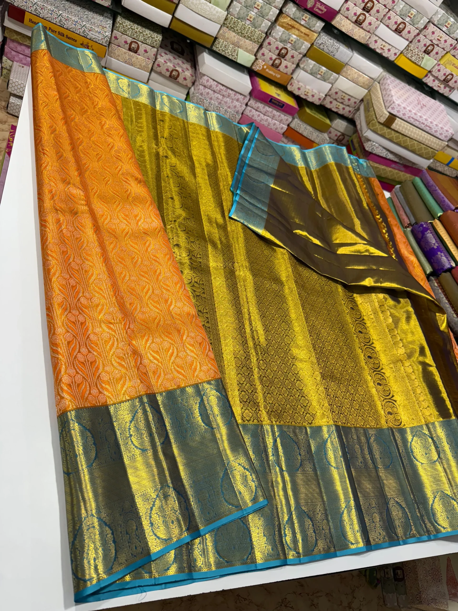 Stunning Gold Raw Silk saree. Crafted for bridal wear, pairs beautifully with silk sarees and lehengas.