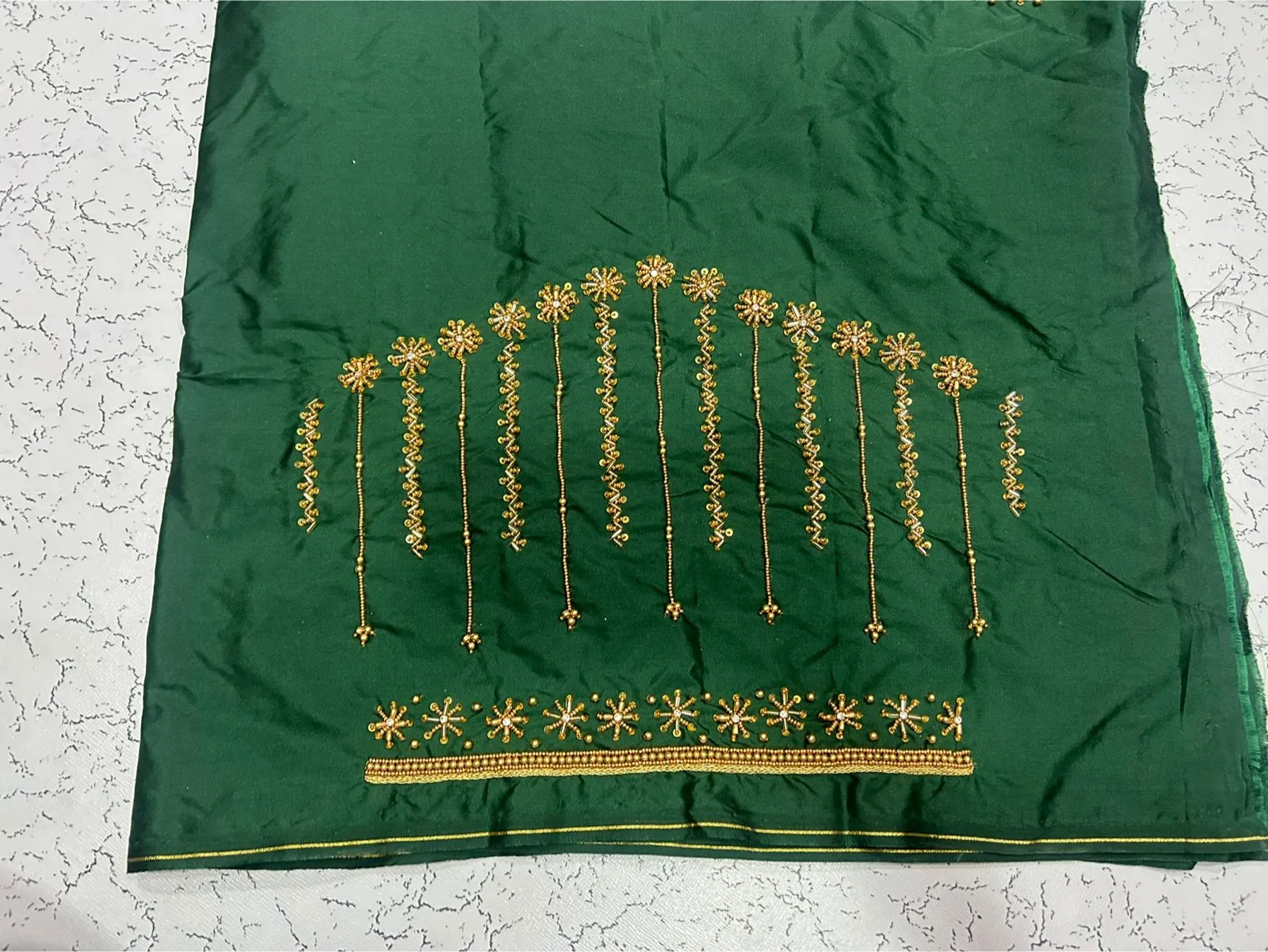 Q: What is the material quality of the Designer Bottle Green Aari Work Blouse?