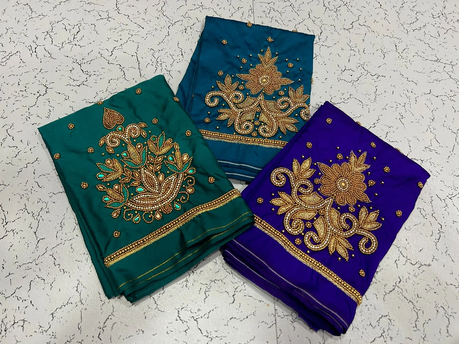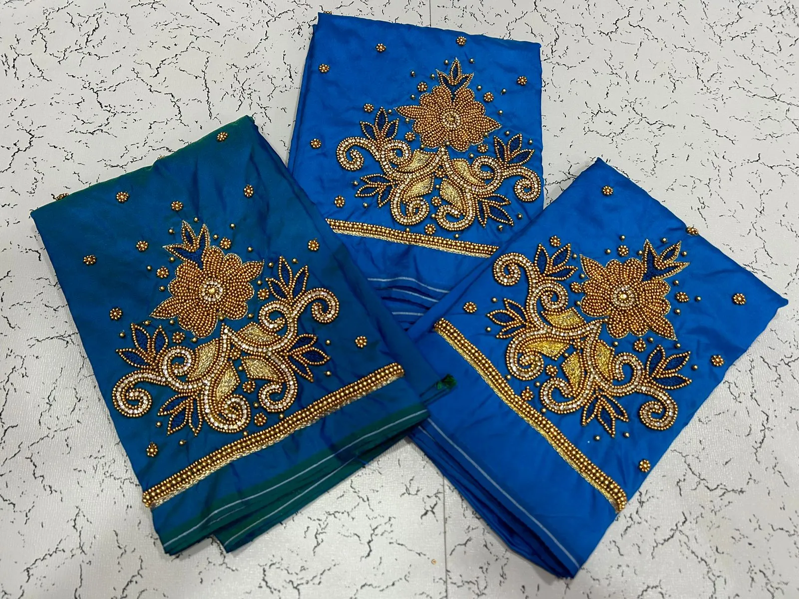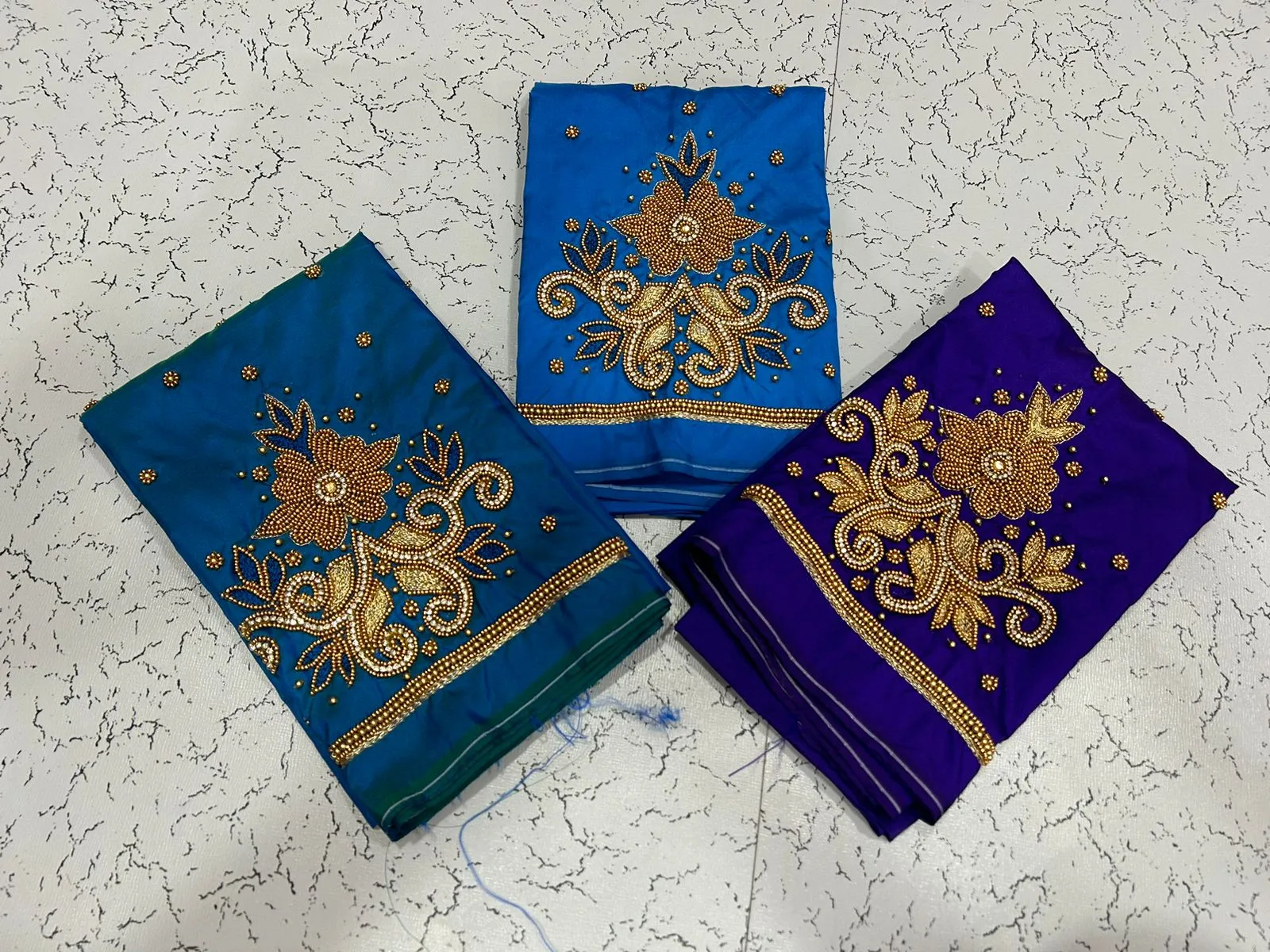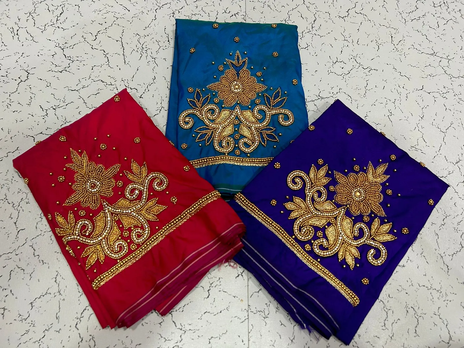 This blouse features premium raw silk and cotton silk fabric. It is available in sizes 32, 34, 36, 38, 40, 42, 44, and 46. Choose from a variety of colors including blue, black, red, green, pink, yellow, lavender, and gold. For more options, browse our collection.