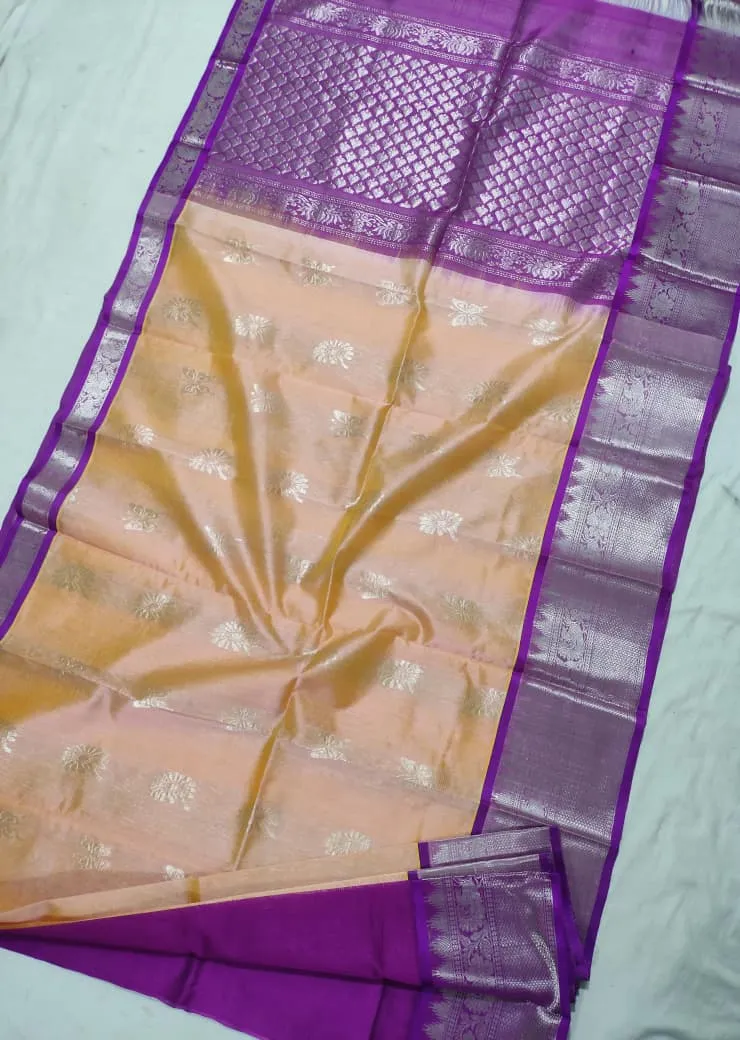 - Moreover, the silver zari Kanchi borders add a stunning touch.