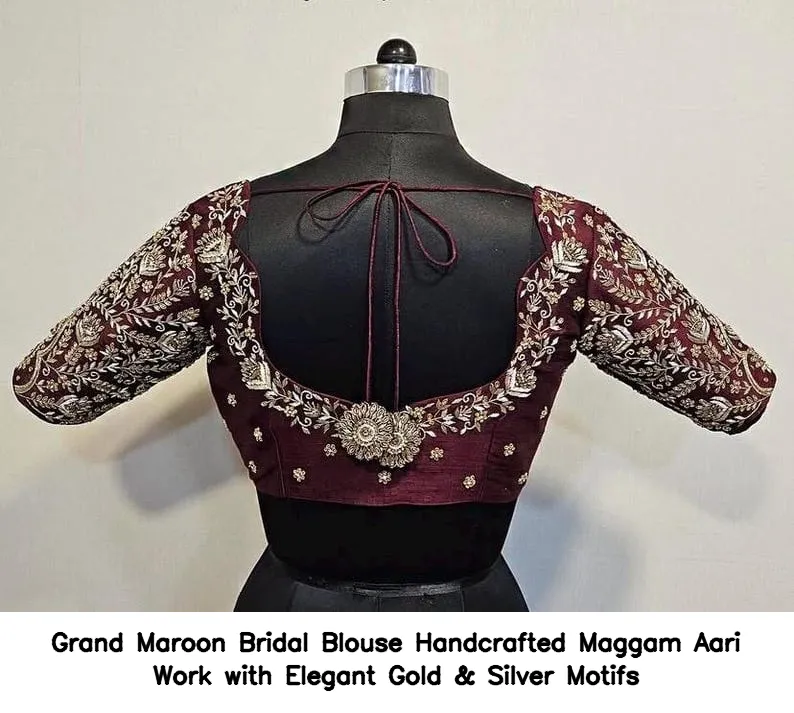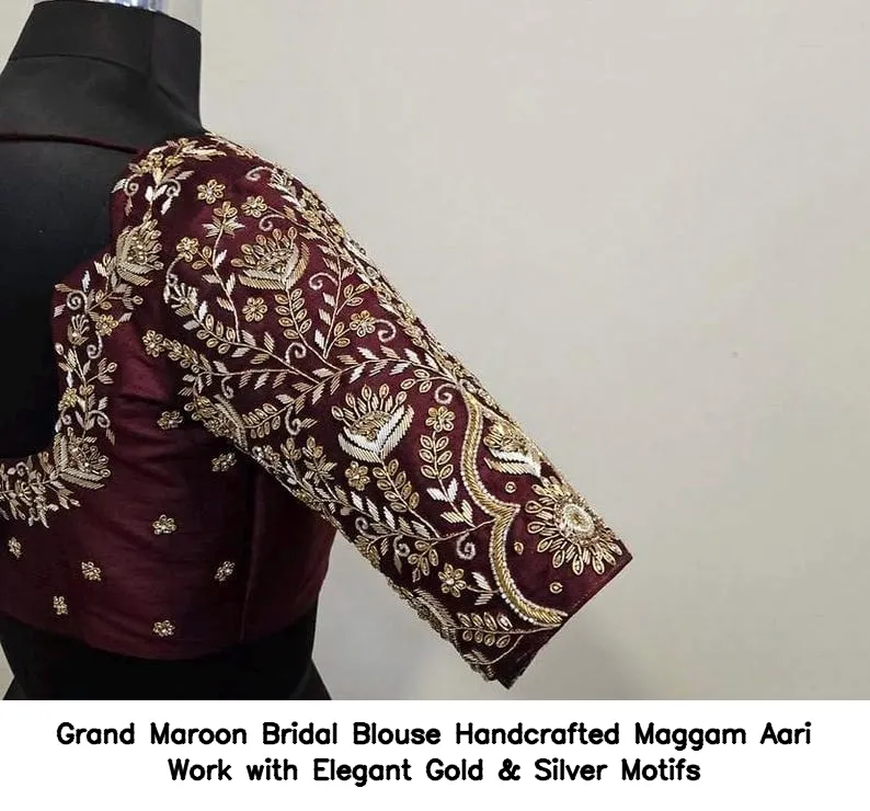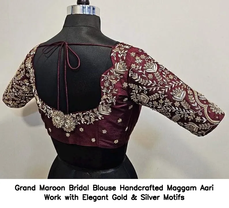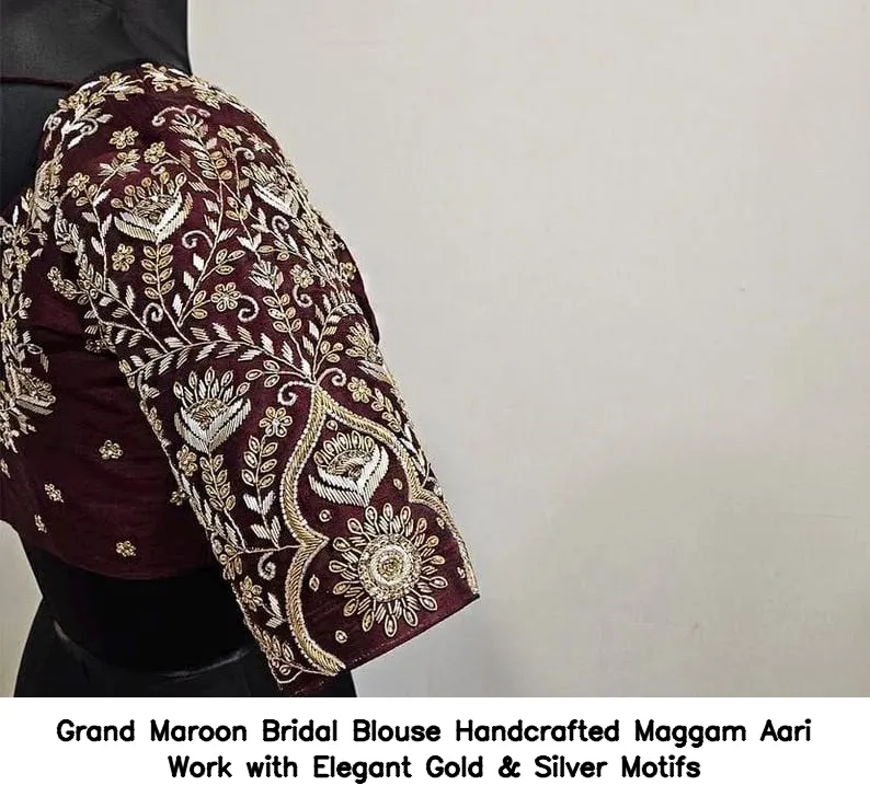 Grand Maroon Bridal Blouse – Handcrafted Maggam Aari Work with Elegant Gold & Silver Motifs