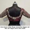 Grand Maroon Bridal Blouse – Handcrafted Maggam Aari Work with Elegant Gold & Silver Motifs offers a unique blend of tradition and style. This exquisite blouse enhances your bridal attire, making you stand out on your special day. Moreover, it is designed with meticulous craftsmanship, ensuring you receive a product of exceptional quality.