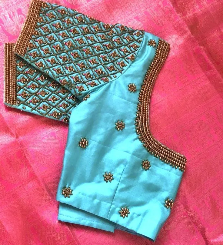 Grand Sky Blue Checks Maggam Work Blouse Perfect for Weddings Festive Wear