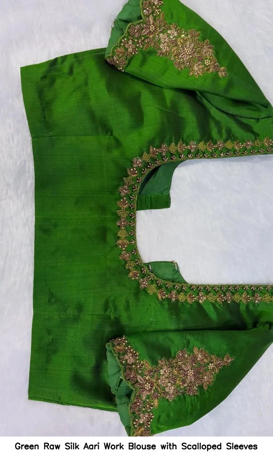 Product Name: Green Raw Silk Aari Work Blouse with Scalloped Sleeves