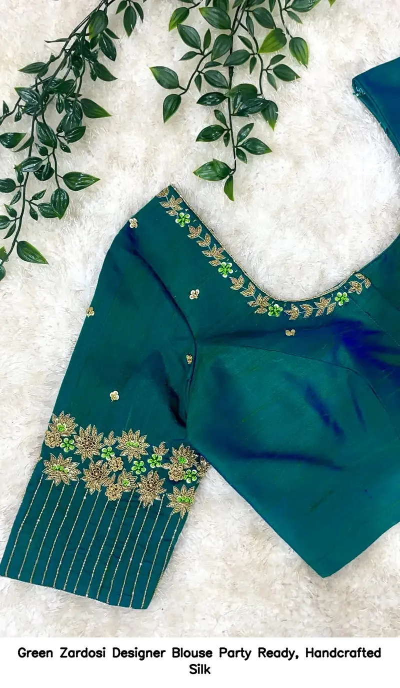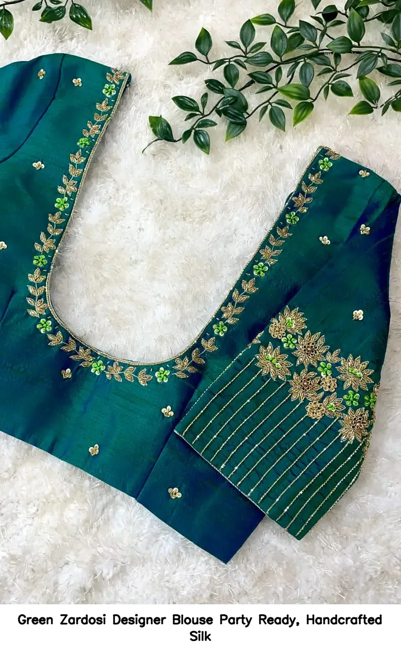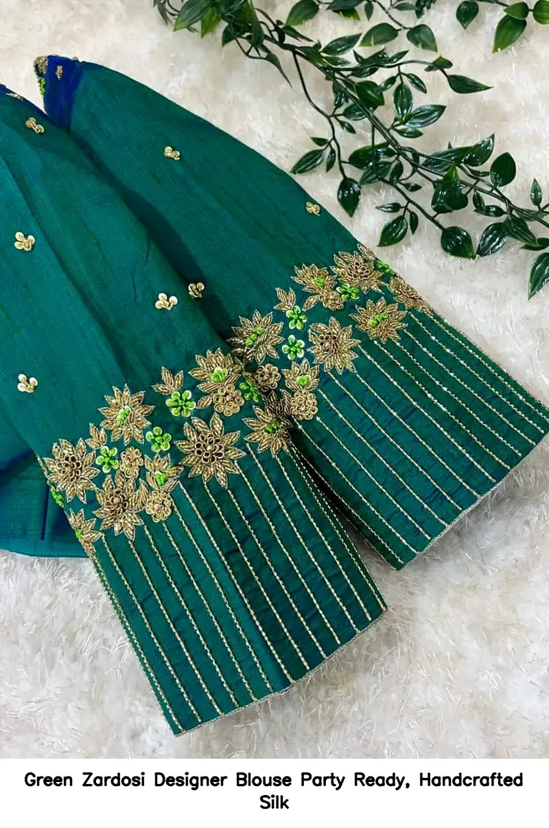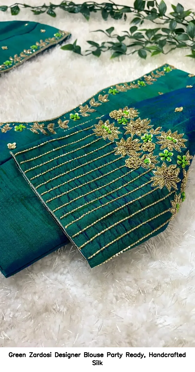Green Zardosi Designer Blouse – Party Ready, Handcrafted Silk is the perfect choice for your next celebration. This exquisite blouse enhances your elegance and style. Moreover, its handcrafted silk fabric ensures comfort and luxury. You will stand out at any party with this stunning piece.