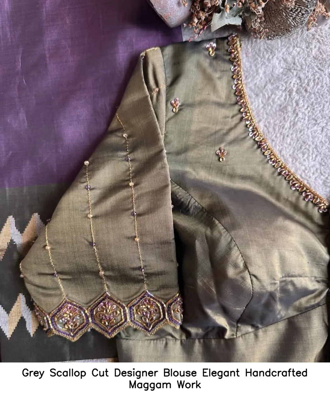 Grey Scallop Cut Designer Blouse – Elegant Handcrafted Maggam Work offers a unique style. Additionally, it features exquisite craftsmanship that elevates any outfit. This blouse is perfect for special occasions, ensuring you stand out effortlessly.