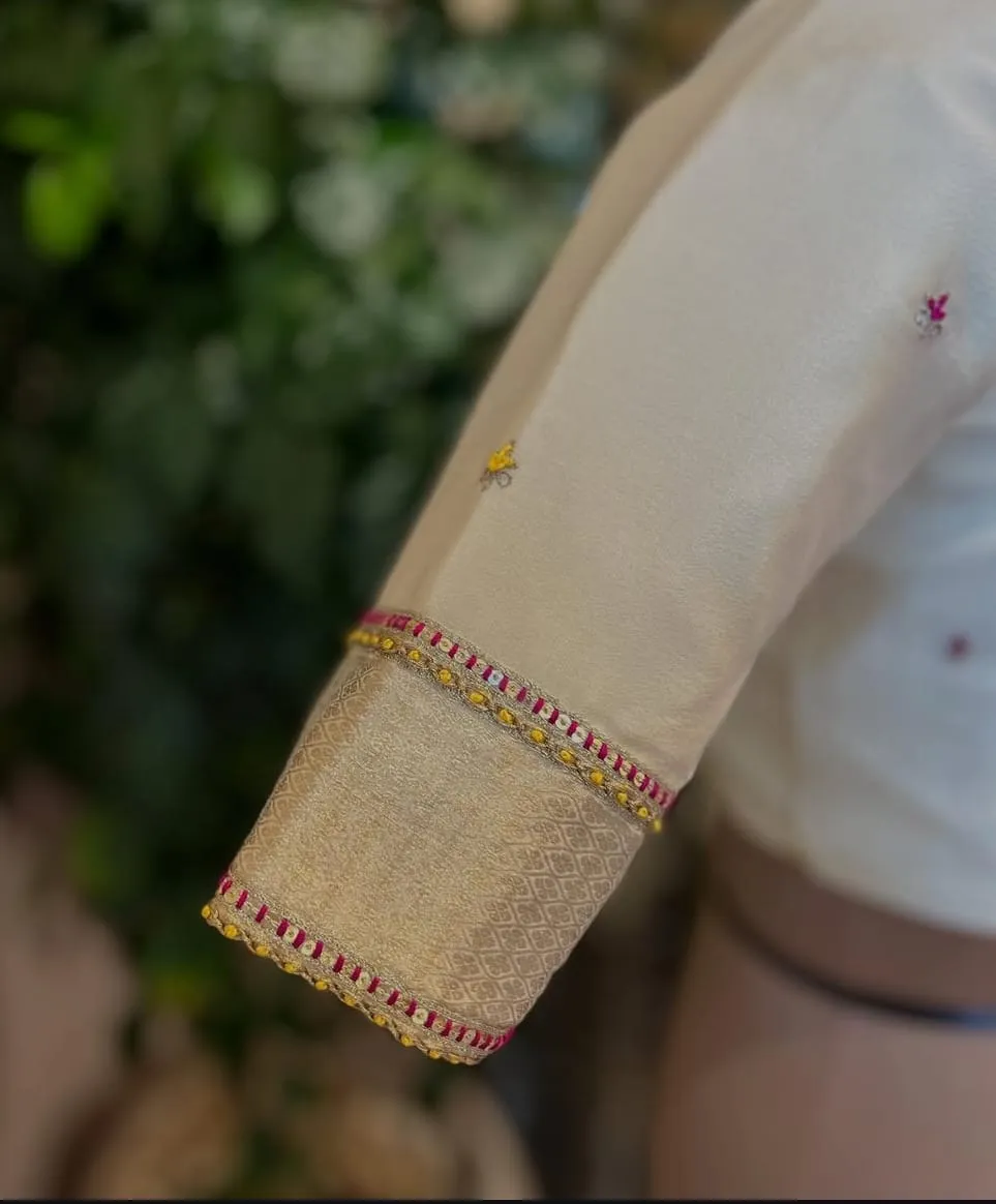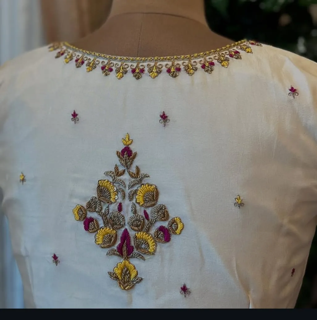 Product Name: Half White Traditional Maggam Work Blouse Handcrafted Beauty in Custom Sizes Price Per Pc: 3500 INR Fabric Details: Raw Silk Half pattu Size: Xl, XXL, 3XL Colors: Red, Pink,Blue ,Purple, wine ,