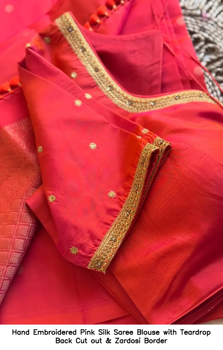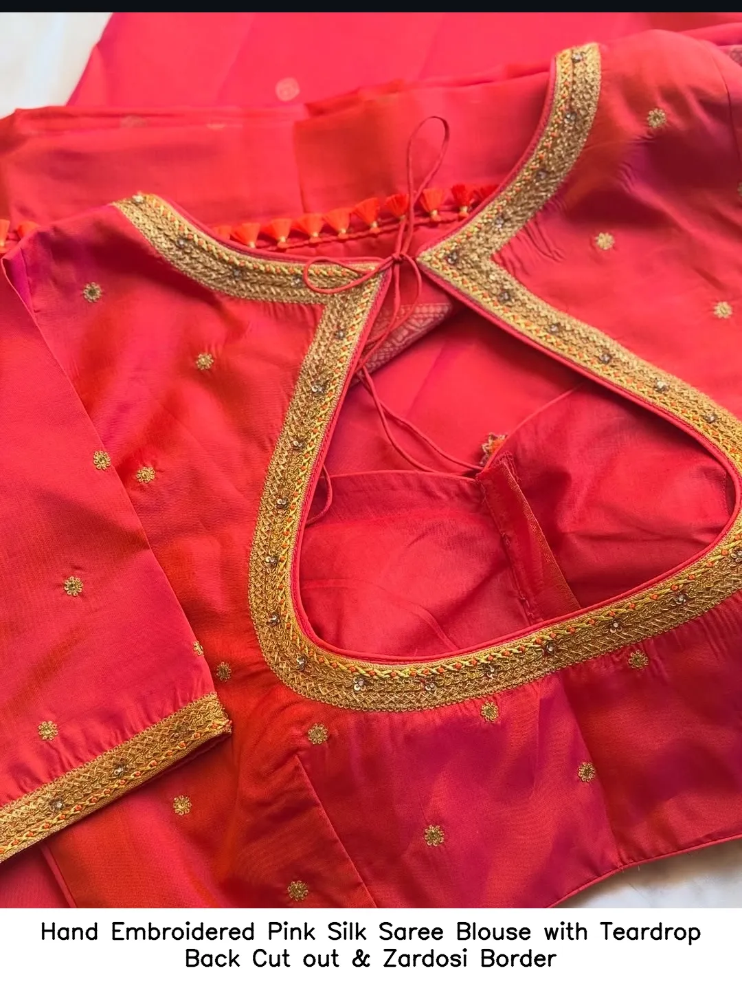 Introducing the exquisite Hand Embroidered Pink Silk Saree Blouse with Teardrop Back Cut out & Zardosi Border. This stunning blouse is designed to elevate your traditional look while providing comfort and elegance.