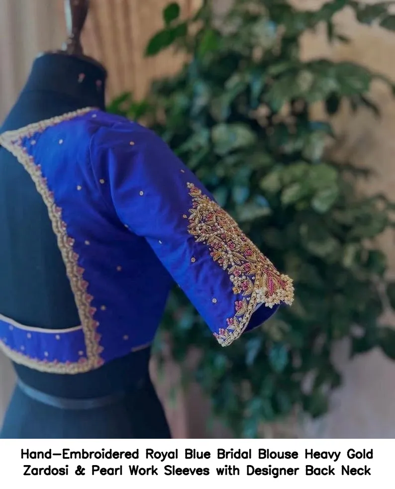 Hand-Embroidered Royal Blue Bridal Blouse – Heavy Gold Zardosi & Pearl Work Sleeves with Designer Back Neck