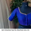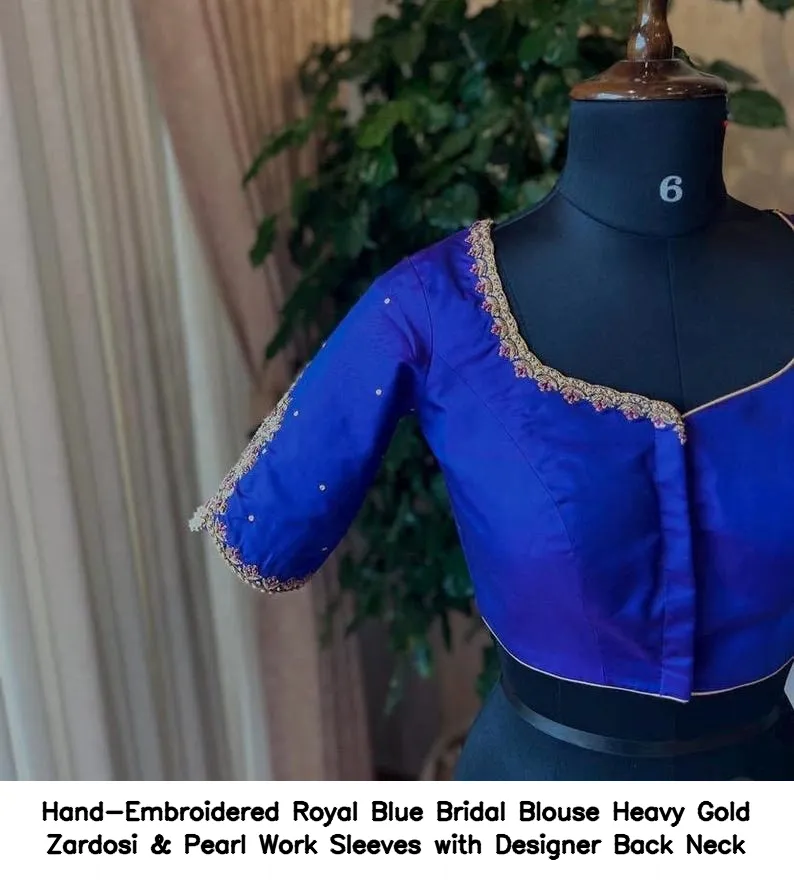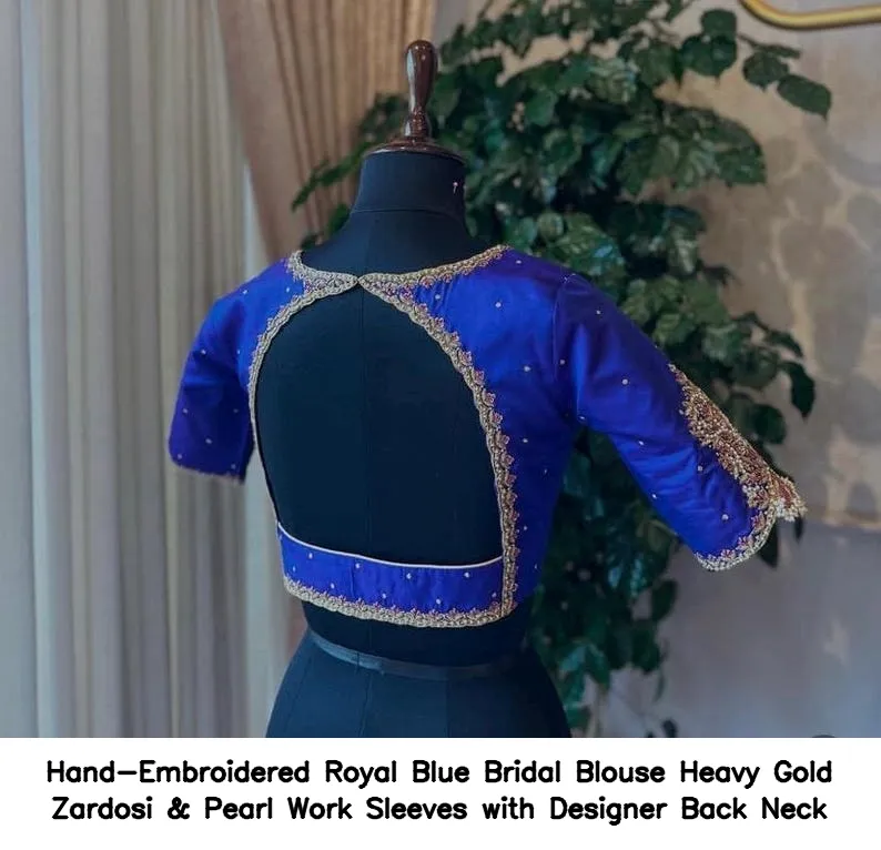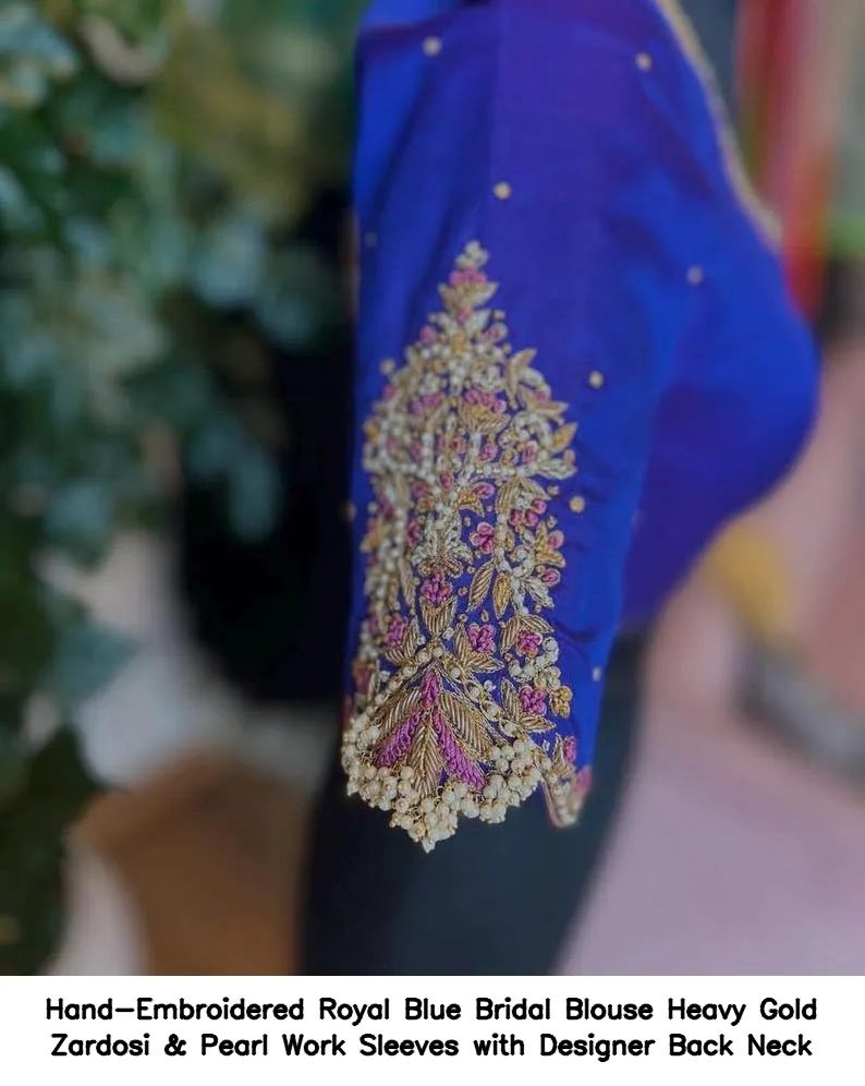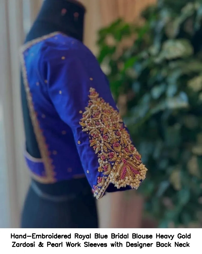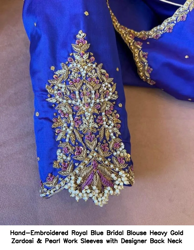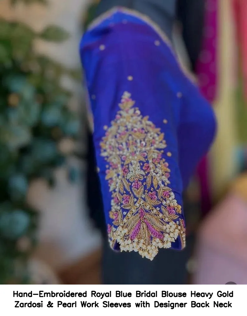 Product Name: Hand-Embroidered Royal Blue Bridal Blouse – Heavy Gold Zardosi & Pearl Work Sleeves with Designer Back Neck