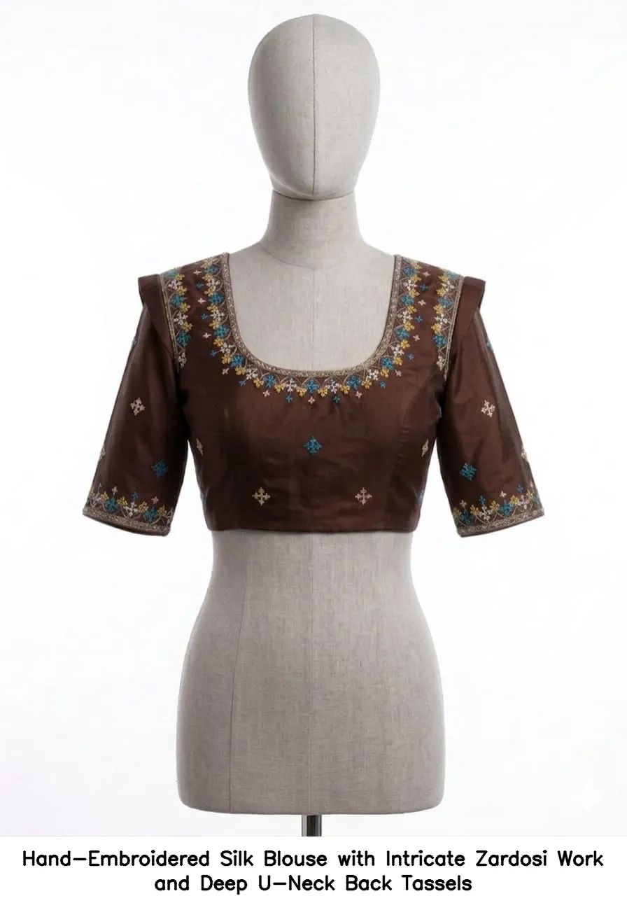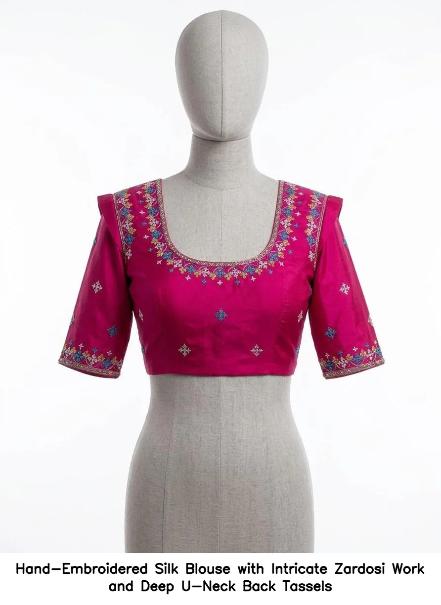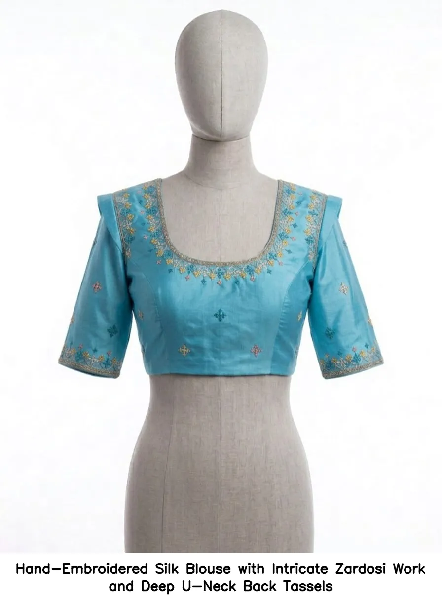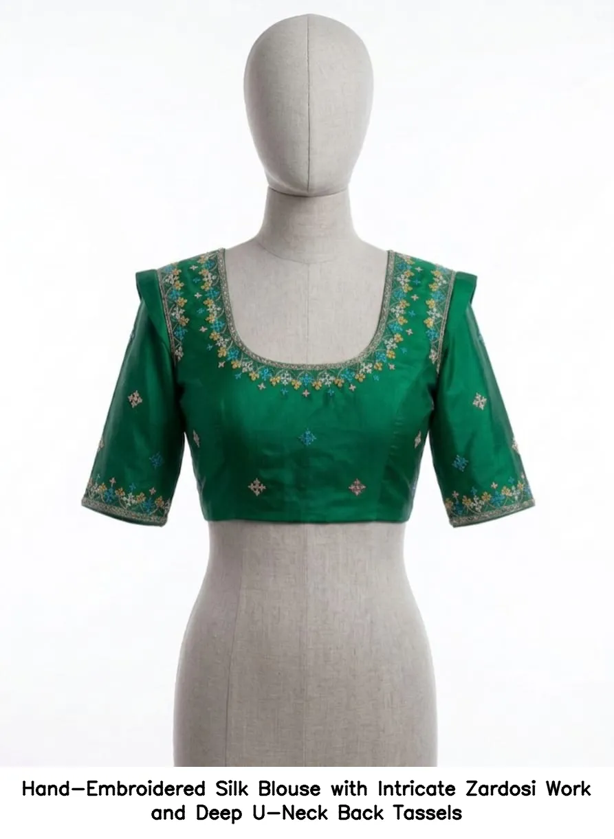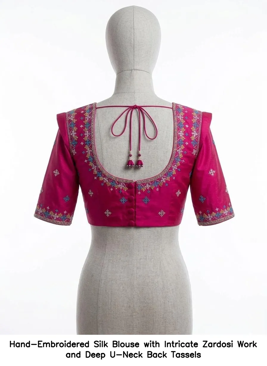 Hand-Embroidered Silk Blouse with Intricate Zardosi Work and Deep U-Neck Back Tassels