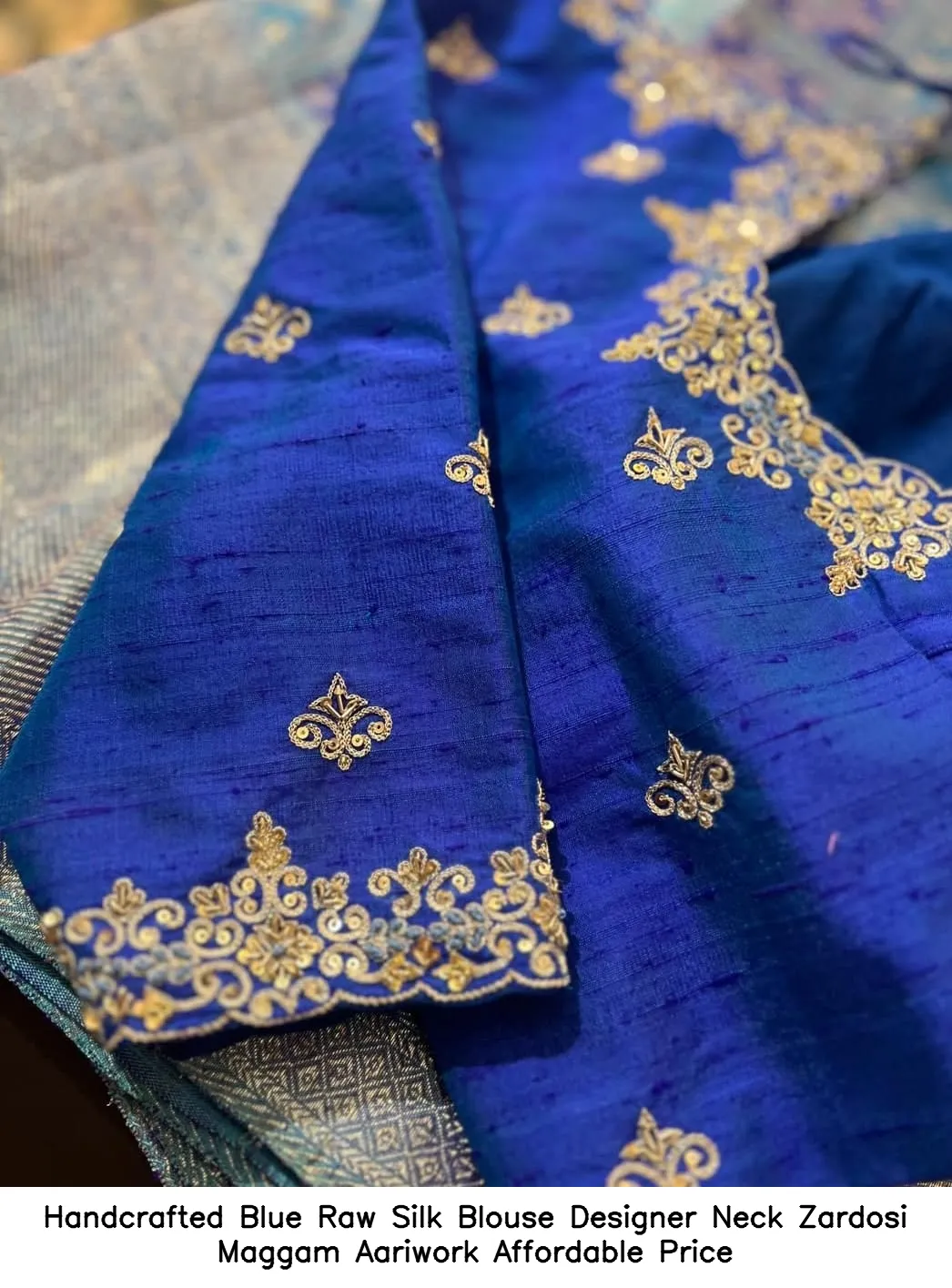 Why Choose Handcrafted Blue Raw Silk Blouse – Designer Neck Zardosi Maggam Aariwork Affordable Price?