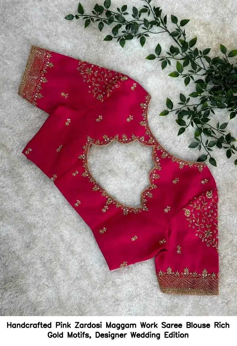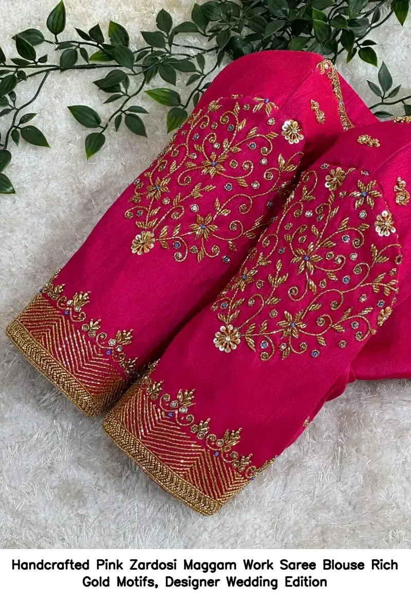 Why Choose Handcrafted Pink Zardosi Maggam Work Saree Blouse – Rich Gold Motifs, Designer Wedding Edition?