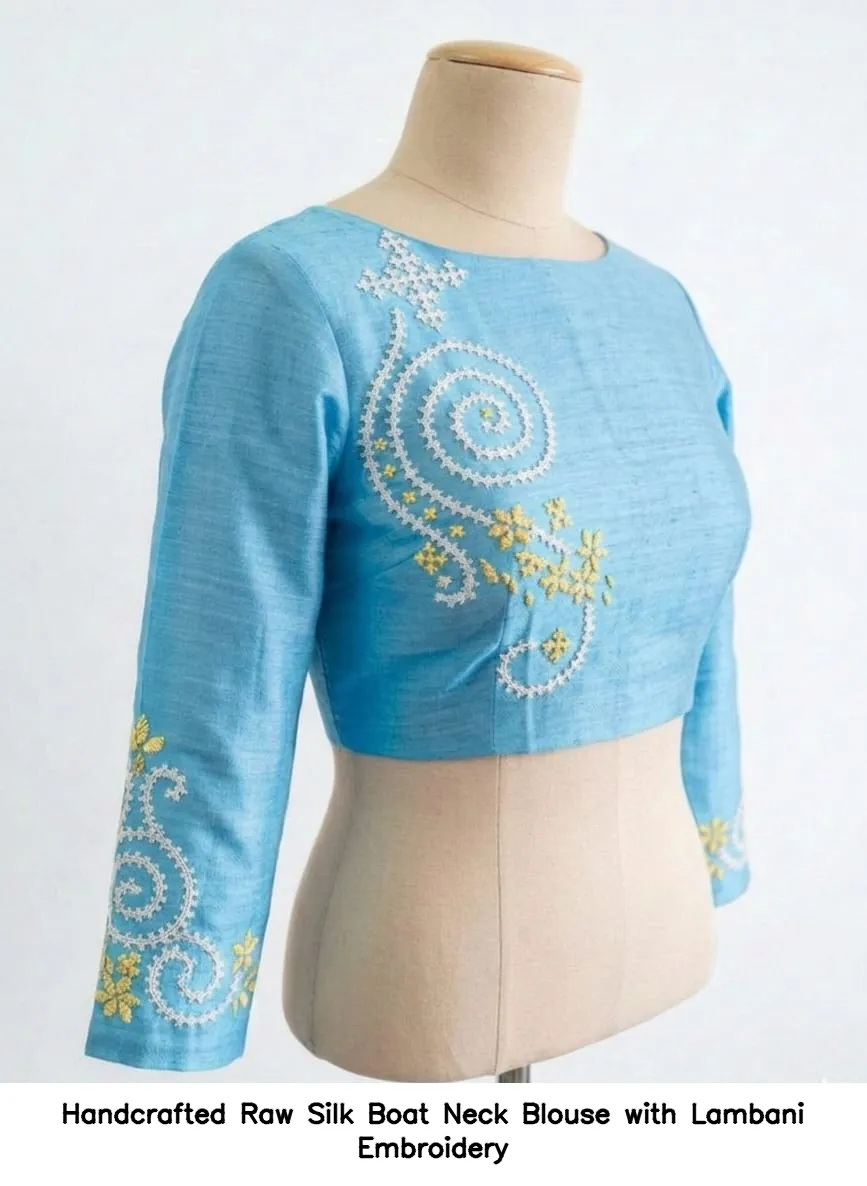 Introducing the exquisite Handcrafted Raw Silk Boat Neck Blouse with Lambani Embroidery. This designer blouse is perfect for any occasion, combining elegance with cultural artistry. Made from high-quality raw silk, it features stunning Lambani embroidery that adds a unique touch to your wardrobe.