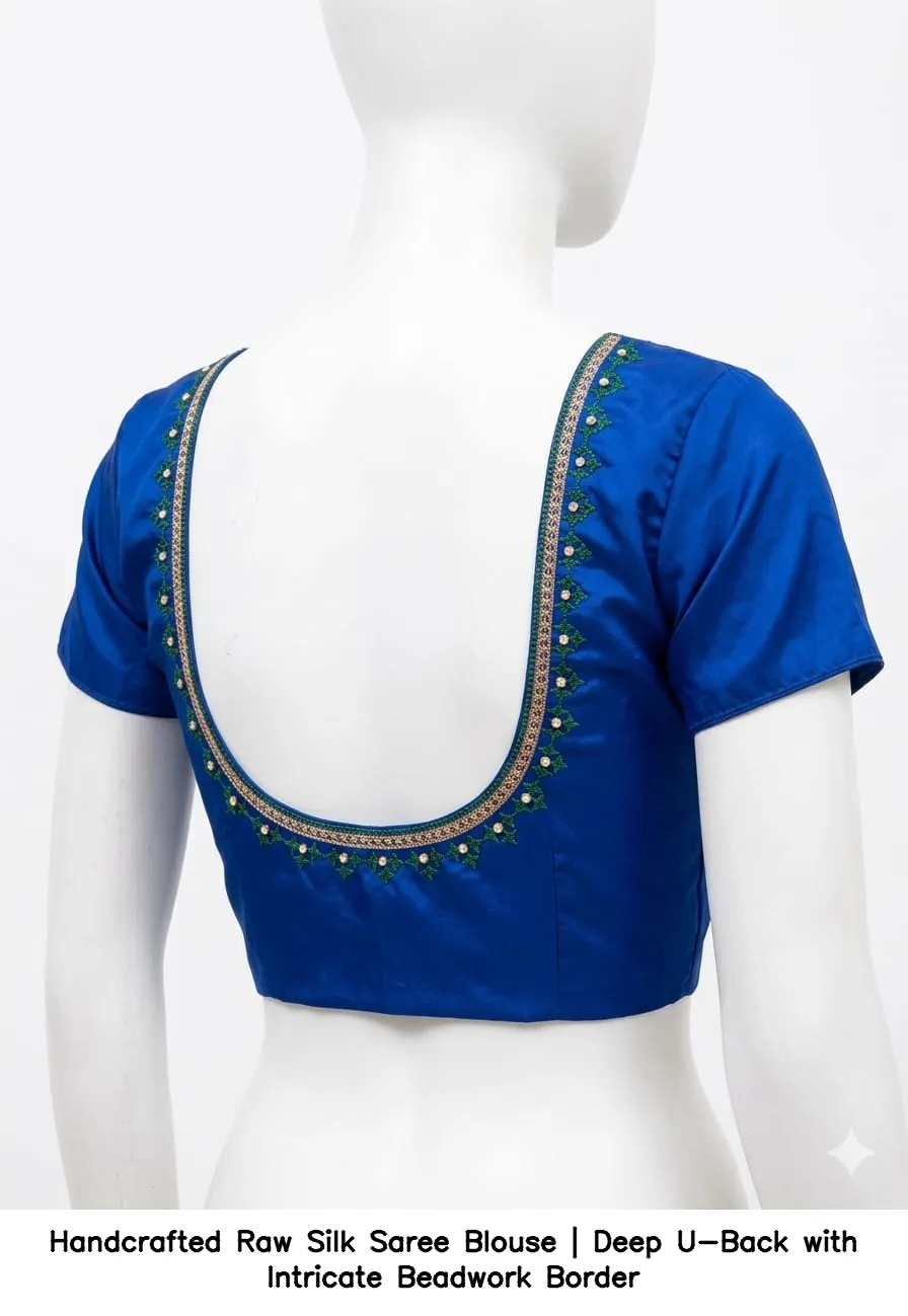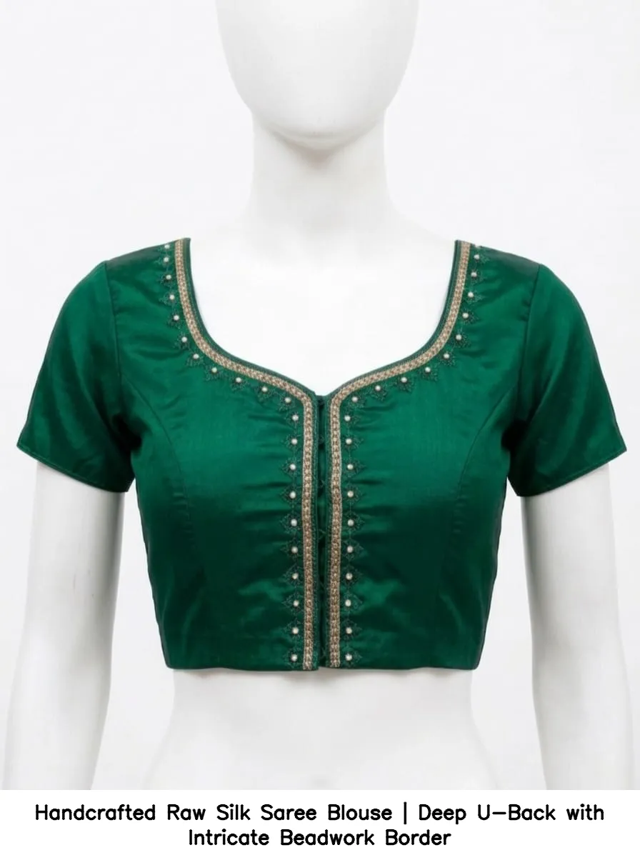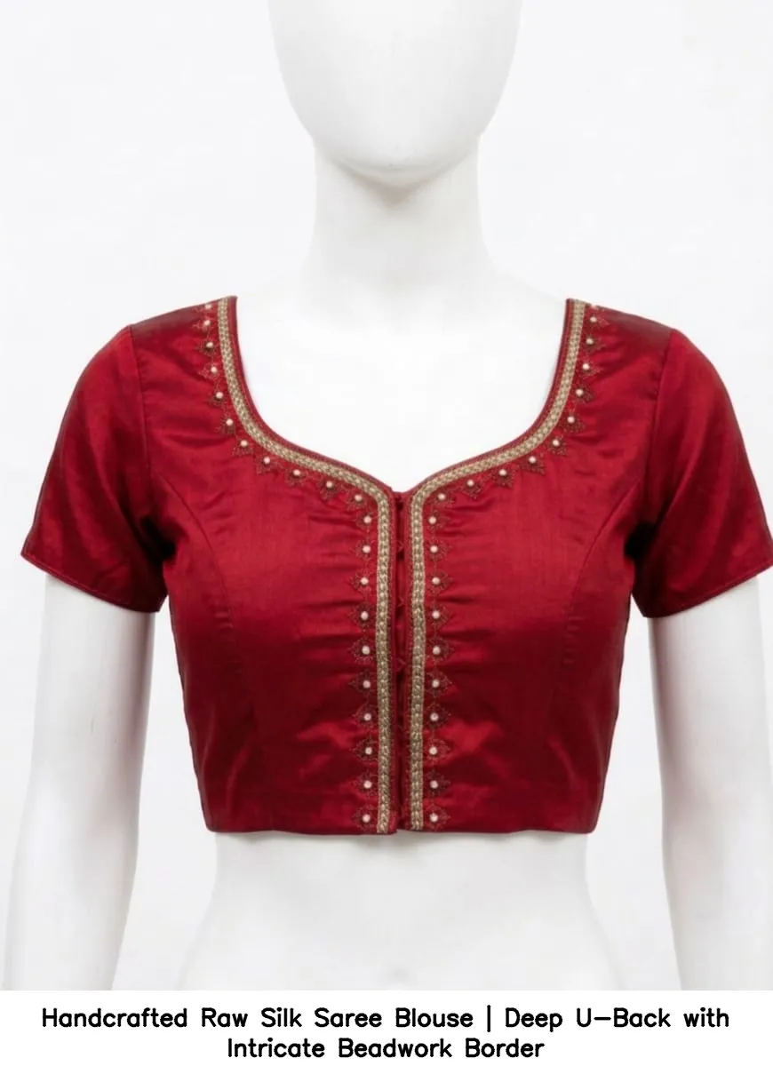 Handcrafted Raw Silk Saree Blouse | Deep U-Back with Intricate Beadwork Border