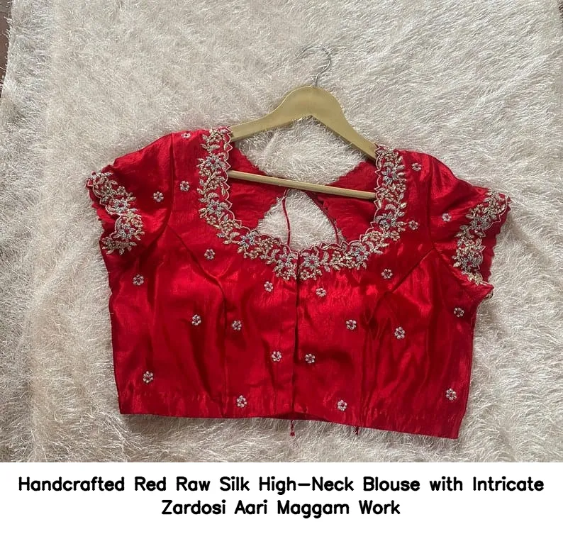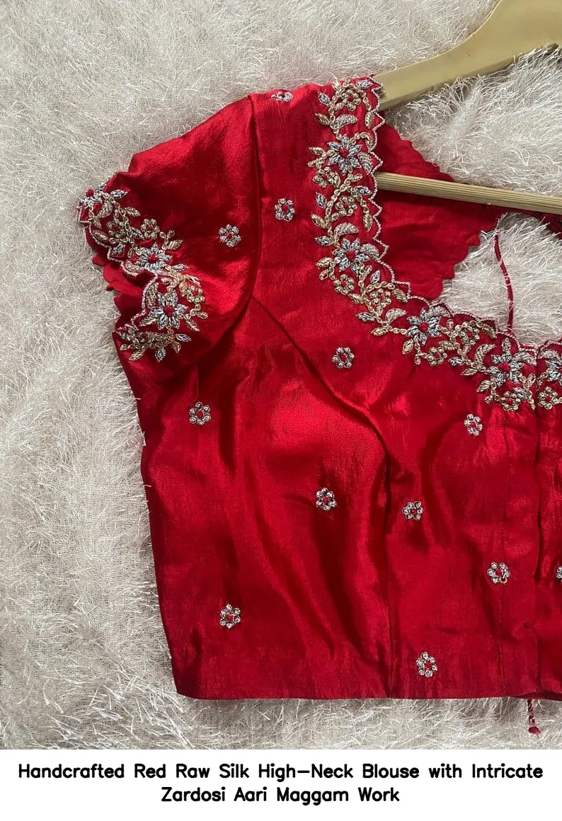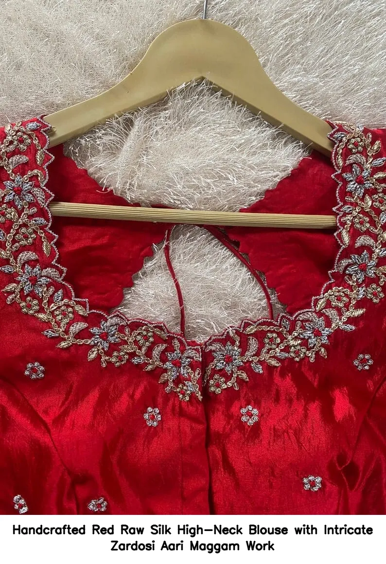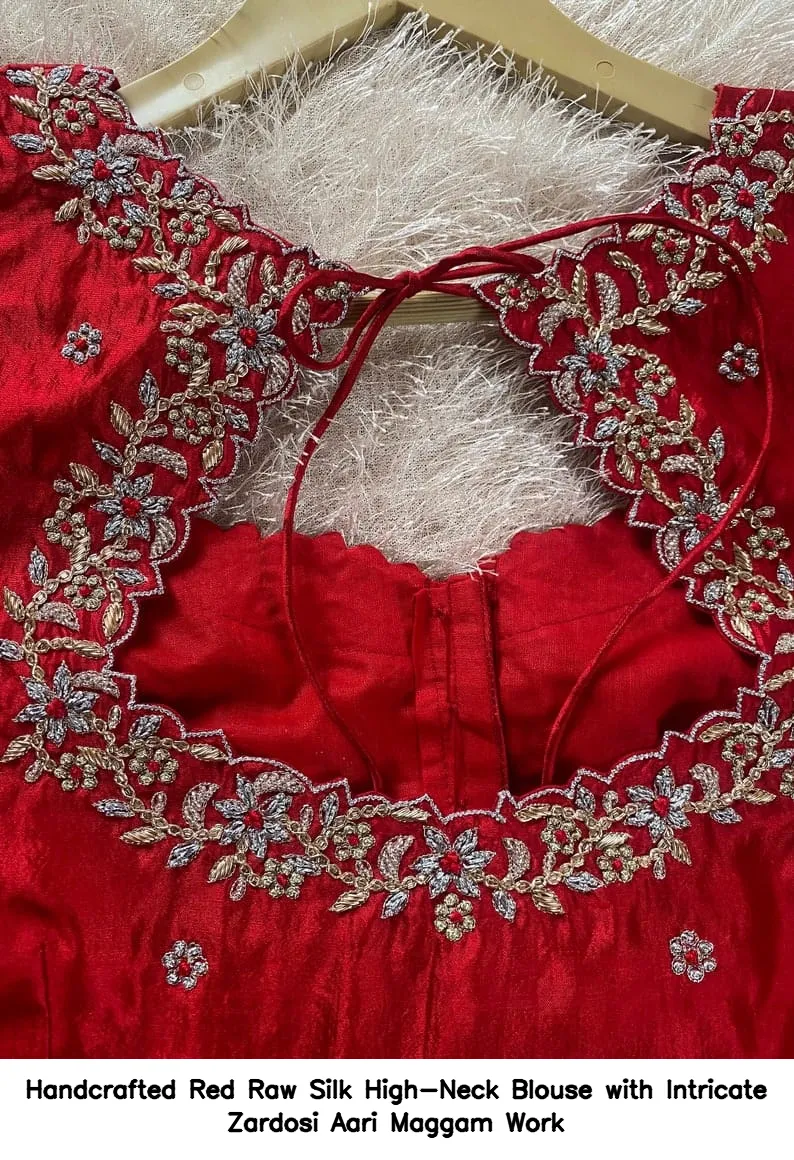 Why Choose Handcrafted Red Raw Silk High-Neck Blouse with Intricate Zardosi Aari Maggam Work?