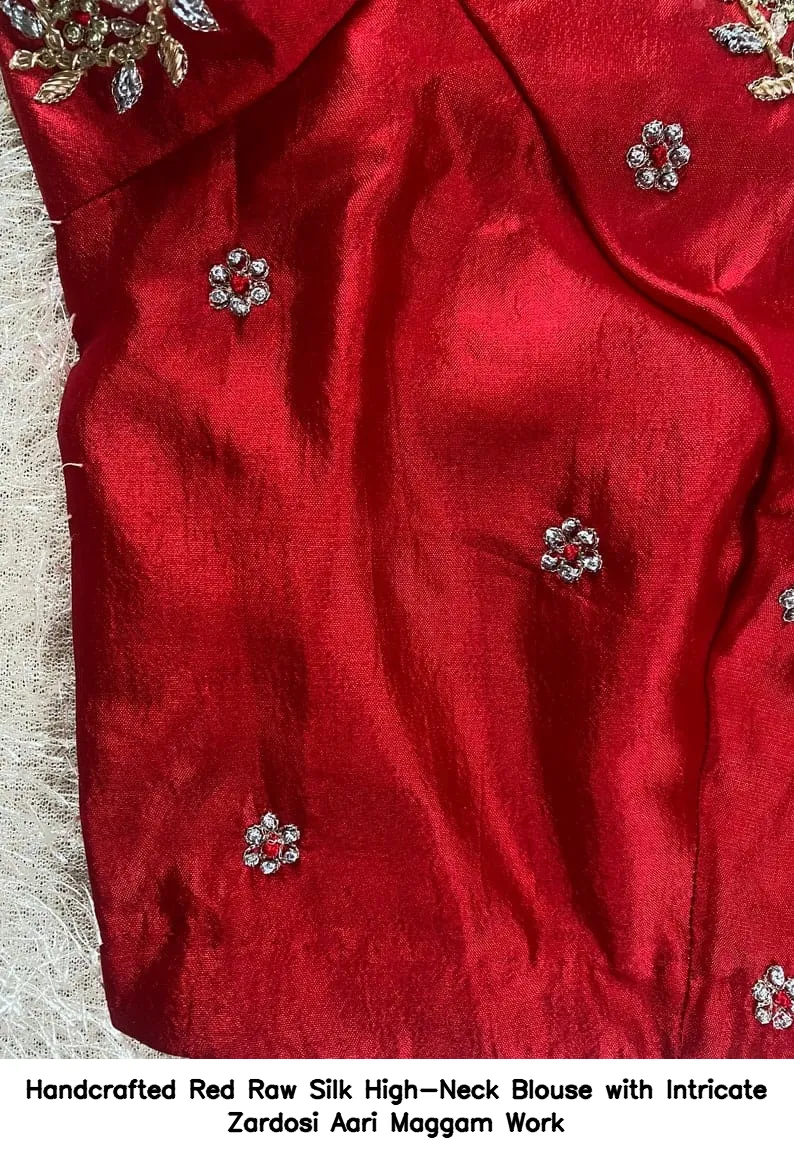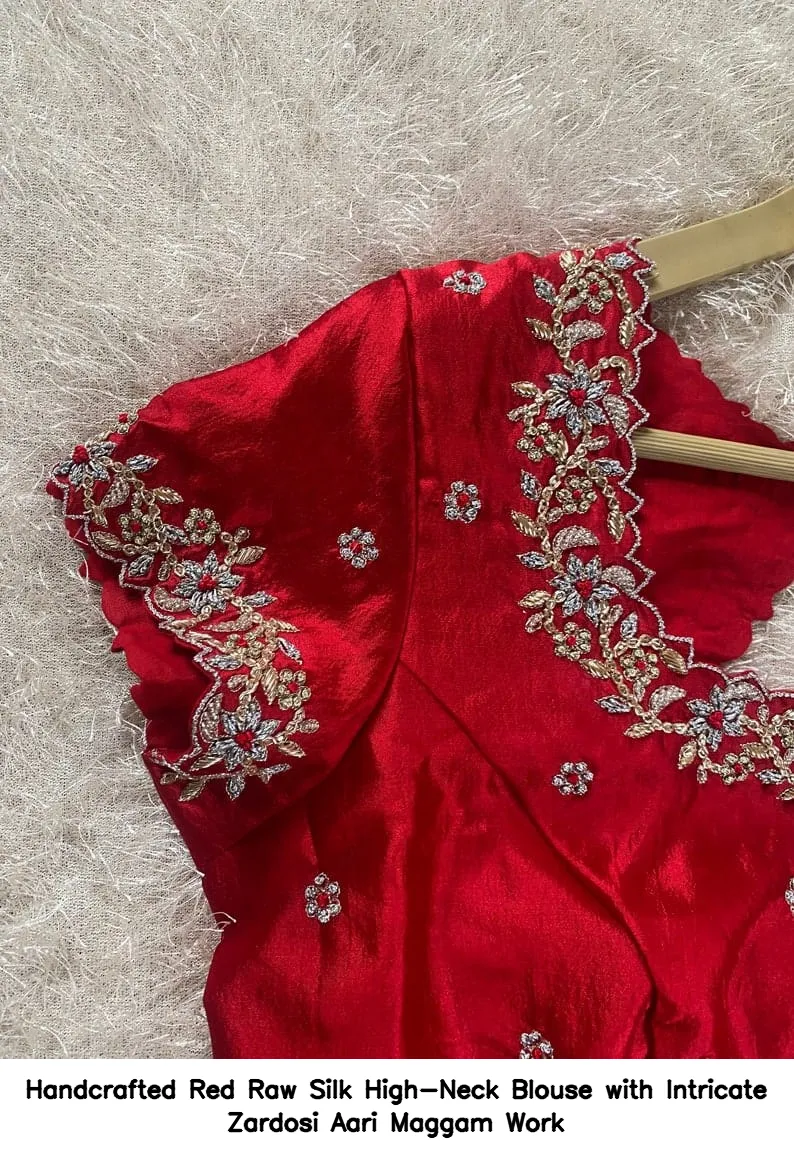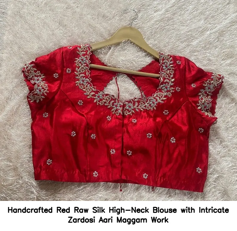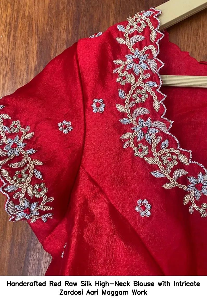Why Choose Handcrafted Red Raw Silk High-Neck Blouse with Intricate Zardosi Aari Maggam Work?